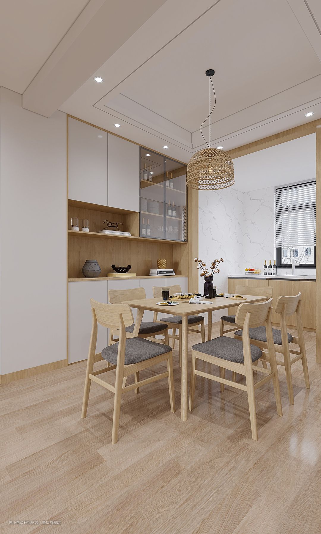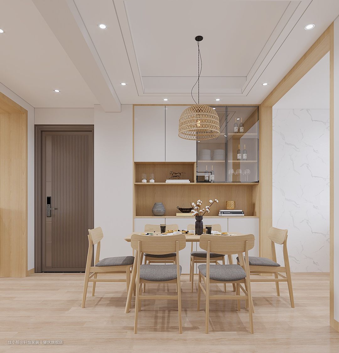 餐厅与全屋的基调一致,木质的餐桌和餐椅,餐厅的温馨不乏烟火气,每天做好早餐,慢悠悠在此享受,想想都是惬意。 餐厅旁边一侧墙体为精美的餐边柜,可以放置日常所需物品,因为距离大门很近,出门在这个柜子内放置物品拿取十分方便。 木色的门框搭配木地板真的太有氛围感了,木纹色质感特别好,显得高级又耐看。