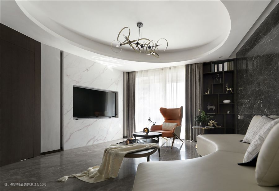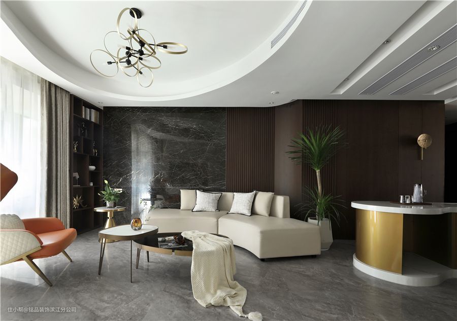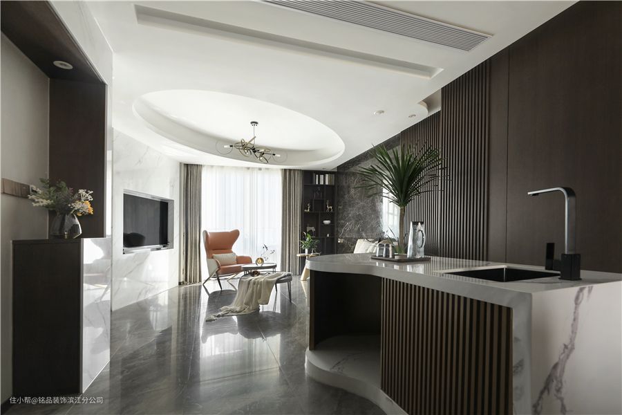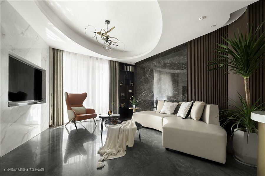 客厅吊顶以一个大的圆形呈现,没有了尖锐的棱角,整个空间显得更加柔和。 沙发、茶几、单人椅和吊灯,目之所及,都是弧形线条,与圆形吊顶更匹配,半围合的布局也将氛围感直接拉满。 沙发背景墙做了大理石➕木格栅的拼接设计,石材选择黑色系,与电视墙形成对比,米白色的转角沙发,完美嵌入墙体,靠窗一侧定制置物格,用摆件填满,装饰墙面。 电视背景墙是一整片的大理石,电视机直接内嵌,更有整体感。底部没有留电视柜的位置,通道走廊会宽敞一点。从客厅看向餐厅视角~开放式的布局,让空间更有通透感。大小茶几搭配组合,实用性、美观性都很高。