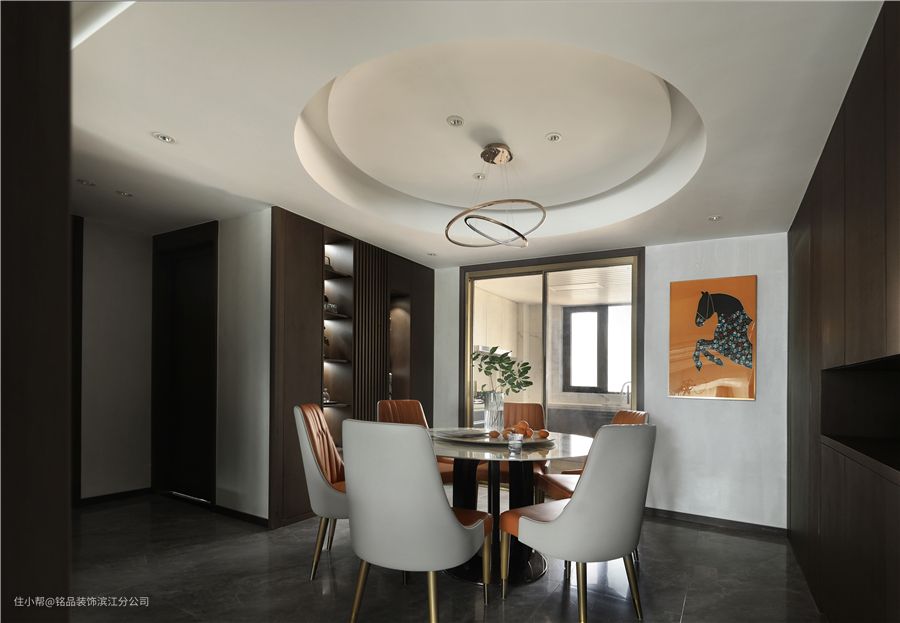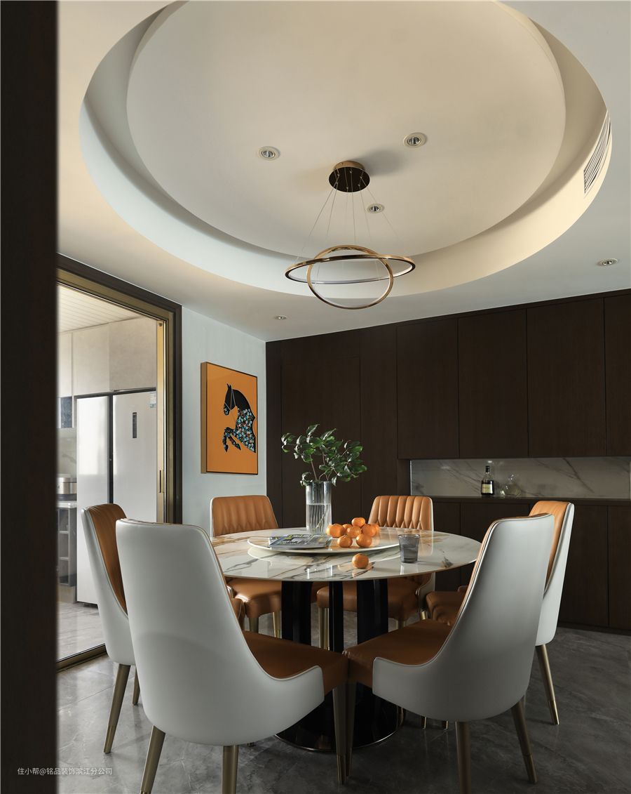 餐厅中的圆形吊顶呼应了空间中的弧形元素,也寓意一家人的团圆和美。 餐桌是大理石双转盘圆形餐桌,方便多人就餐时夹菜。餐椅的金属底座,是考虑到女业主对于金属质感的喜爱所特意挑选的,整体质感个性十足。 靠墙定制一排餐边柜,柜门以胡桃木材质为主,中部留出台面,方便置物。墙上的奔马画是依据餐椅所挑选的,空间色彩更加丰富多元。