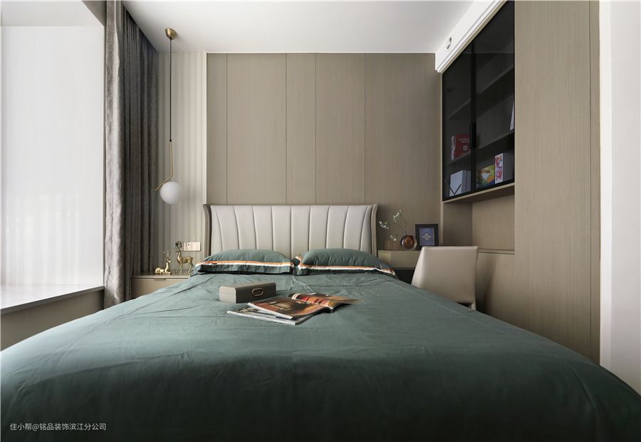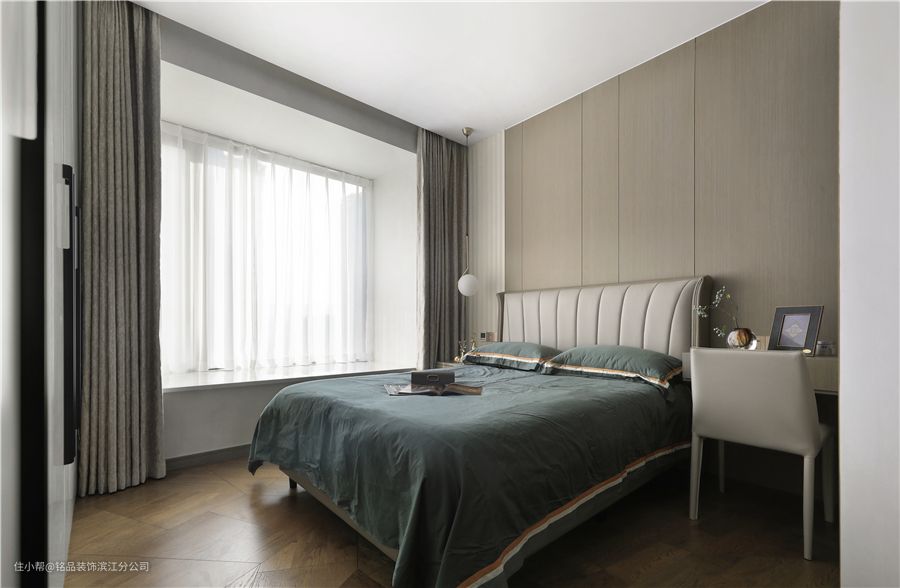 卧室进门处做了一排衣柜,也是一个简单的衣帽间。柜门选择了可透视的亚克力板,方便女业主拿取衣服。卧室背景墙采用木饰面+白色格栅设计,浅色系的运用让空间更显温馨柔和,床也匹配了一款米色系风格,整体上看起来很协调 利用床头柜的区域,做了一个简易的梳妆台,一侧做置物柜,缓解书桌压力,可以摆放更多物品。 床尾也做了一整排衣柜,柜门以白色为主,有放大空间的效果,黑色拉手的设计,让平面空间更有层次立体感。
