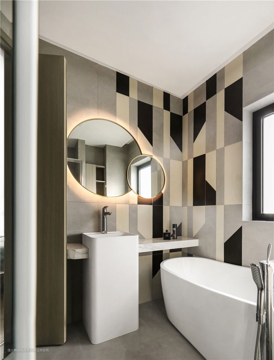 卫生间的设计比较前卫,墙面以不规则的几何砖拼接,用三种颜色搭出设计感。化妆镜是大小圆组合,搭配上灯带,更有氛围感。 台盆区选择了轻巧小型的面板+台上盆,尾部放了智能马桶、淋浴房和浴缸,可以满足屋主多种洗浴需求。浴缸墙挖出壁龛,用来存放日常洗漱物品,方便洗澡使用。