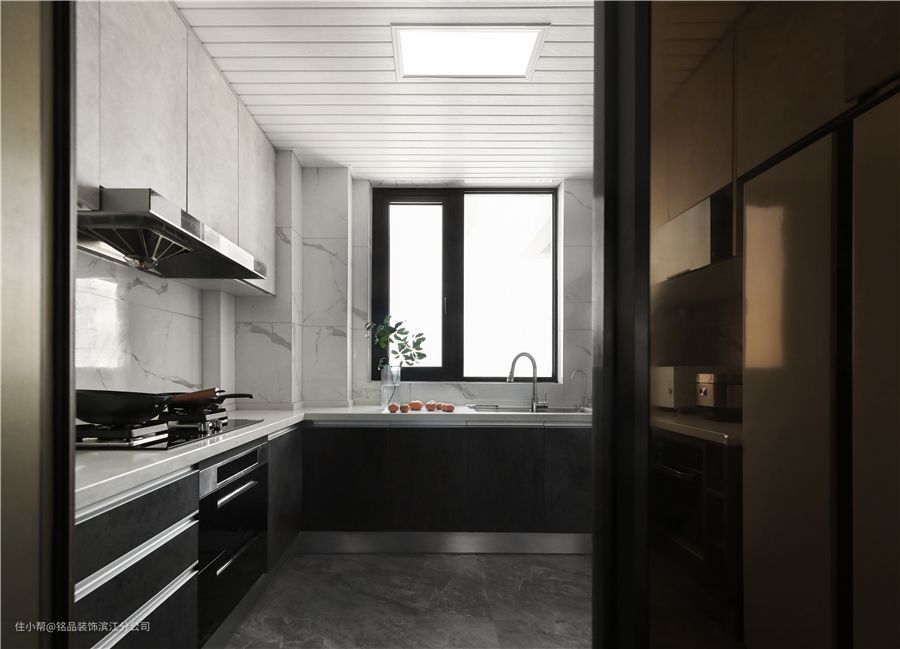 厨房是最实用的U型布局,所有厨房电器、冰箱都能融入空间。橱柜以白+黑的分色设计呈现,更有层次感。白色大理石墙砖将色系过渡的很自然。