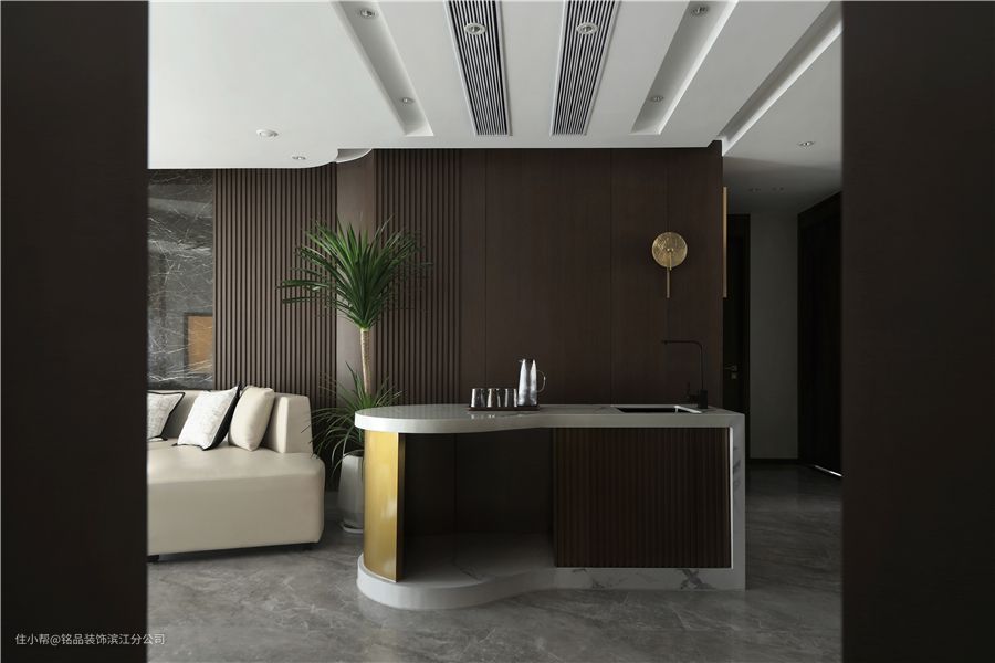 玄关墙的设计是沙发背景墙的延伸,融入了当下最流行的木格栅和木饰面,入户就给人温馨大气的感觉。玄关柜内的金属材。