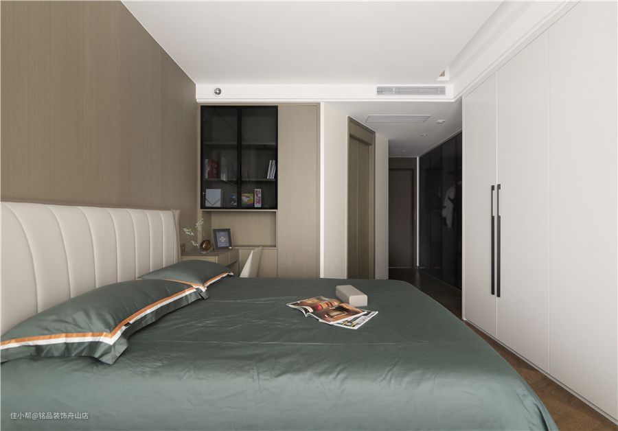 卧室进门处做了一排衣柜,也是一个简单的衣帽间。柜门选择了可透视的亚克力板,方便女业主拿取衣服。卧室背景墙采用木饰面+白色格栅设计,浅色系的运用让空间更显温馨柔和,床也匹配了一款米色系风格,整体上看起来很协调 利用床头柜的区域,做了一个简易的梳妆台,一侧做置物柜,缓解书桌压力,可以摆放更多物品。 床尾也做了一整排衣柜,柜门以白色为主,有放大空间的效果,黑色拉手的设计,让平面空间更有层次立体感。