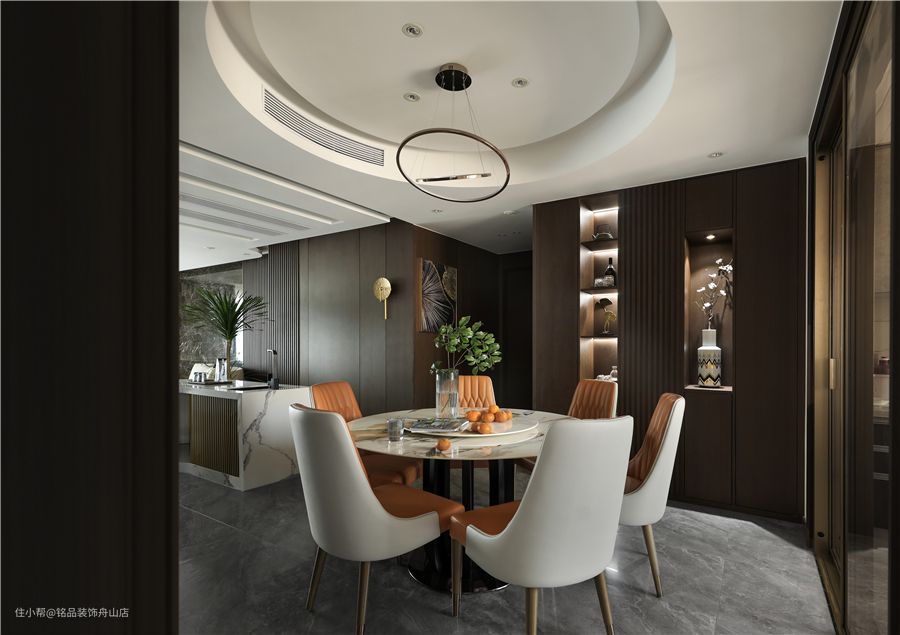客厅吊顶以一个大的圆形呈现,没有了尖锐的棱角,整个空间显得更加柔和。 沙发、茶几、单人椅和吊灯,目之所及,都是弧形线条,与圆形吊顶更匹配,半围合的布局也将氛围感直接拉满。 沙发背景墙做了大理石➕木格栅的拼接设计,石材选择黑色系,与电视墙形成对比,米白色的转角沙发,完美嵌入墙体,靠窗一侧定制置物格,用摆件填满,装饰墙面。 电视背景墙是一整片的大理石,电视机直接内嵌,更有整体感。底部没有留电视柜的位置,通道走廊会宽敞一点。从客厅看向餐厅视角~开放式的布局,让空间更有通透感。大小茶几搭配组合,实用性、美观性都很高。