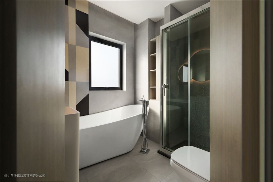 卫生间的设计比较前卫,墙面以不规则的几何砖拼接,用三种颜色搭出设计感。化妆镜是大小圆组合,搭配上灯带,更有氛围感。 台盆区选择了轻巧小型的面板+台上盆,尾部放了智能马桶、淋浴房和浴缸,可以满足屋主多种洗浴需求。浴缸墙挖出壁龛,用来存放日常洗漱物品,方便洗澡使用。
