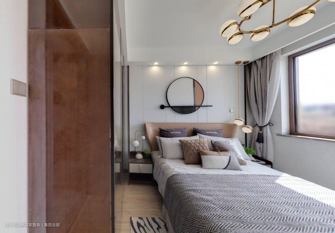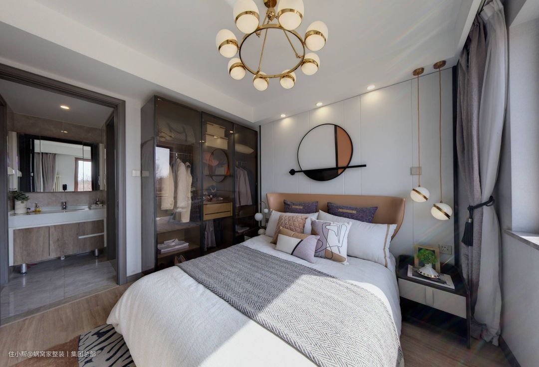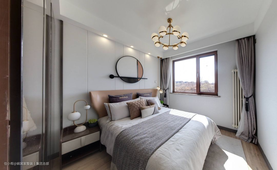 主卧吊顶+主灯的搭配,让人又新鲜感而又不会显得压抑,吊顶房梁位嵌入筒灯,小山丘形状的灯光打在墙上,丰富视觉层次感。