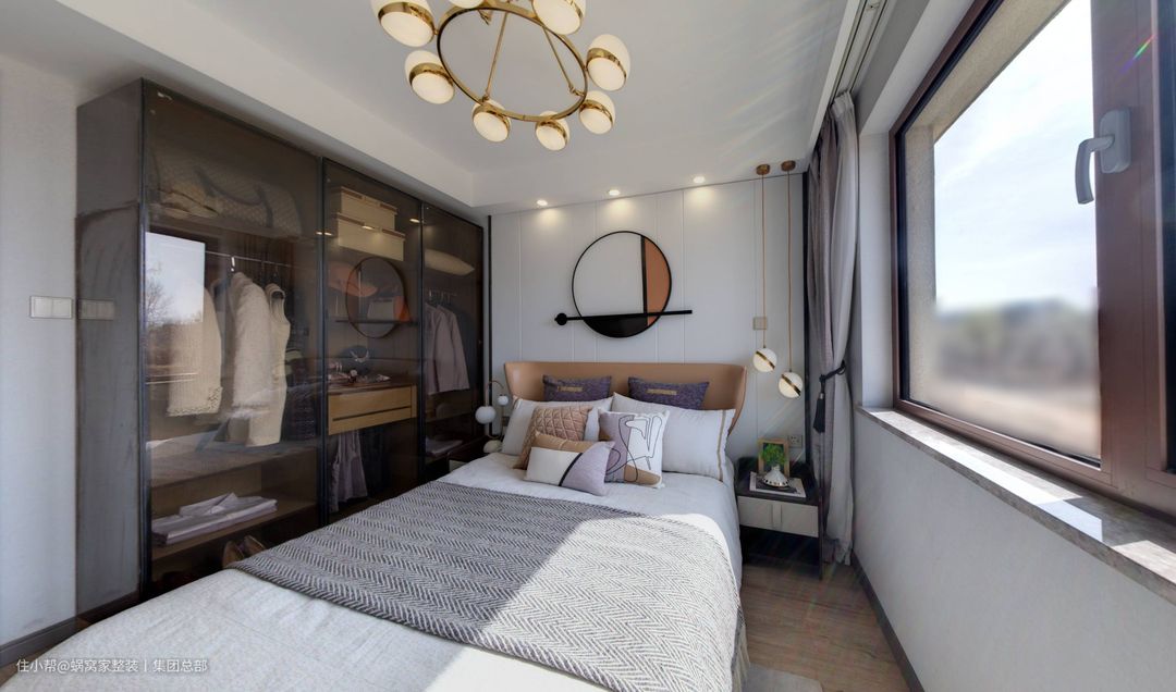 一柜到顶的设计,规避长时间使用,衣柜头顶积灰的现象,同时扩大了主卧的收纳空间,通透的玻璃表面,让收纳更加便捷。