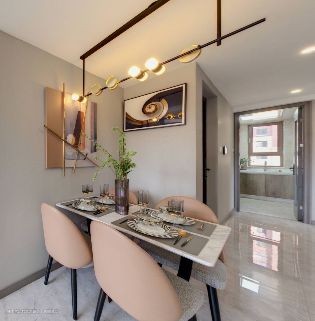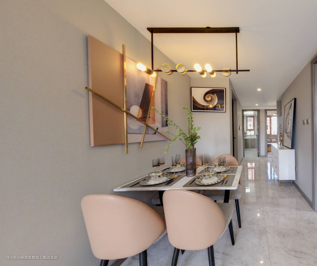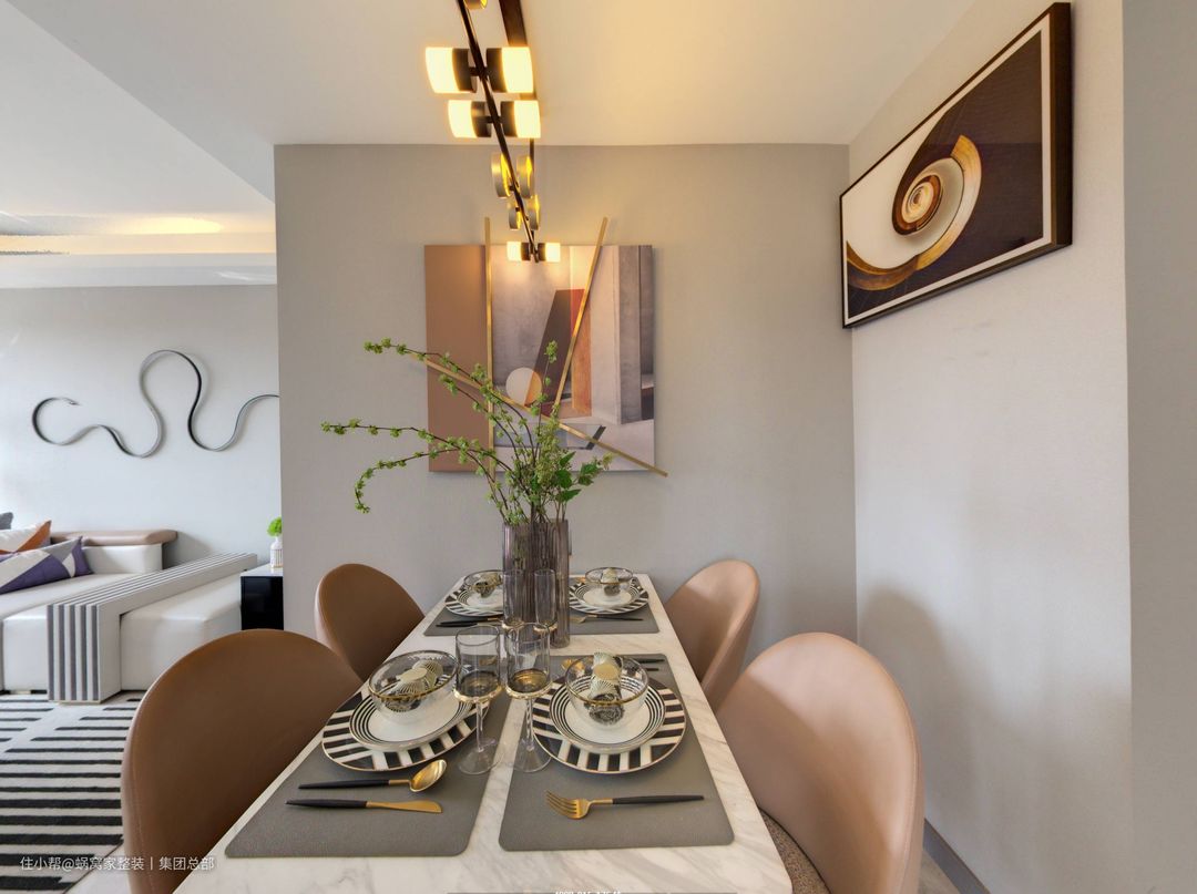 白色大理石纹理的餐桌,搭配肉色的餐椅,整体氛围稳重又不失优雅,在主灯的烘托下,整体用餐氛围更显高级。