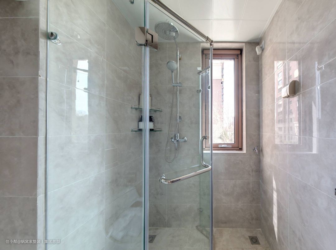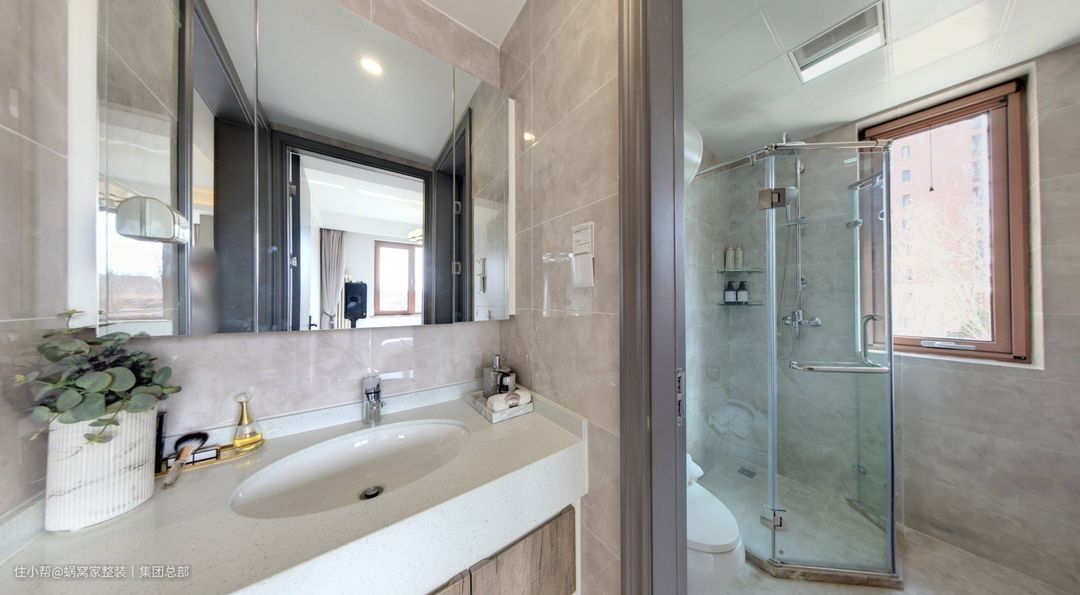 卫生间用玻璃门做干湿分离,减少了干区的积水,不仅方便业主日常打扫卫生,还能有效防止卫生间因为地滑而摔倒。