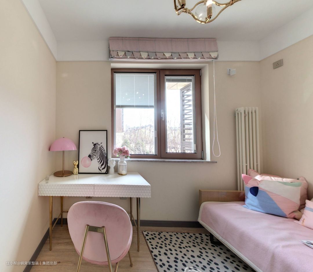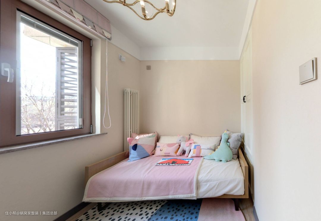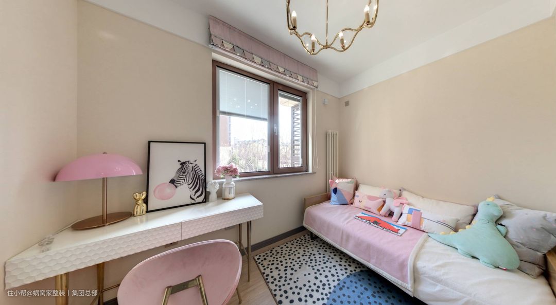 次卧做为儿童房,整体色调更偏梦幻,呈王冠形状的主灯,更受孩子的喜爱。舒适的床靠墙摆放,安全性更高。