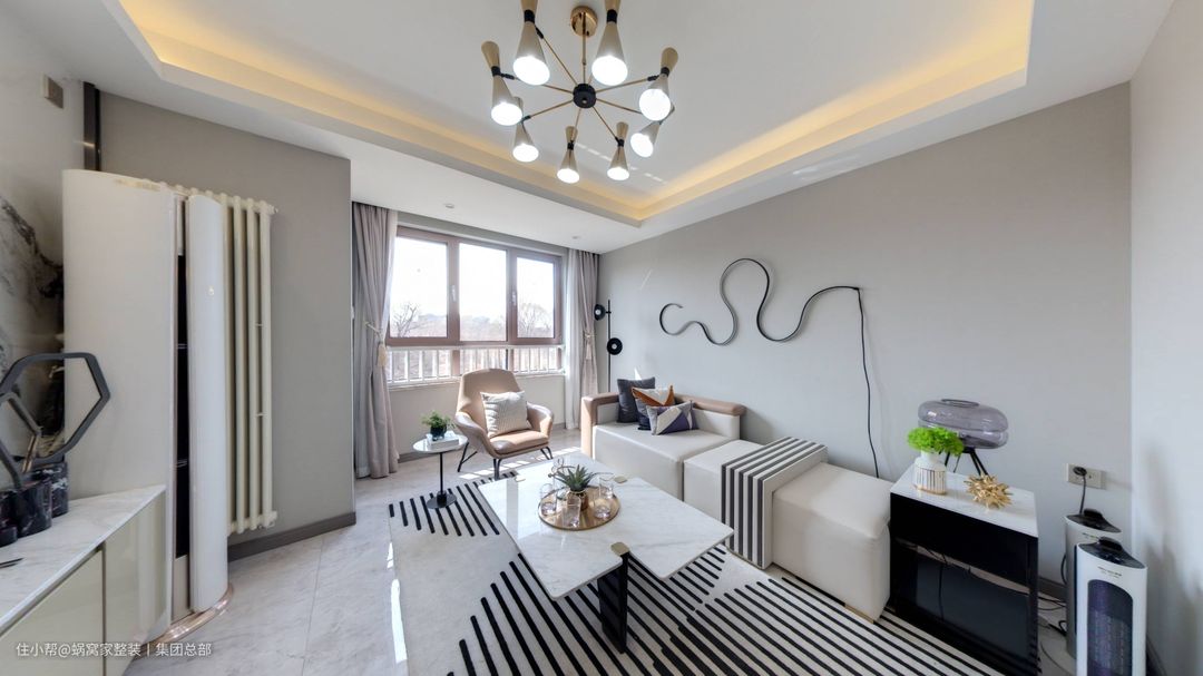 客厅整体户型方正,但采光和动线都还不错,设计师巧妙的利用白色与黑色搭配,彰显整个客厅十分质朴的格调。