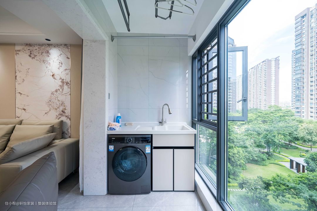 客厅采用灰色的简约风格,创造出一个现代而舒适的空间。墙面选择米白色,营造出宁静和平衡的氛围。搭配简约的家具,如灰色皮艺沙发、白色电视柜等,以保持整体风格的统一性。中性色调既能提供稳定和平静的感觉,又能为空间增添一份优雅和现代感。 在灯光方面,选择柔和而充足的照明,如筒灯或吊灯,以营造温馨的氛围。同时,可以在客厅中增添一些装饰品,如抱枕、植物等,以增加层次感和自然元素。整体上,中色系色简约风格的客厅创造出一个舒适、时尚且宜人的休息和娱乐空间。 另外靠近窗户的地方设计成了一个阳台放了自动洗衣机、洗手台、收纳柜。还有一个自动升降的衣架。更好的方便晾晒衣物。