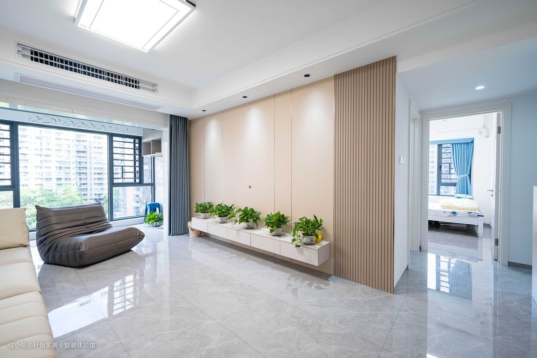 装修需求: 1、客厅面积大合理利用一下。 2、自然与现代元素的结合:将自然元素与现代设计融合,创造一个和谐统一的装修风格。运用自然材料、绿色植物和自然光线,营造温馨自然的氛围,同时融入现代设计元素,展现时尚与舒适的结合。 3、自然与现代元素的结合。 设计亮点: 1、客厅分成了阳台跟客厅,阳台上放着洗衣机。 2、空间流畅和通透感:注重空间布局,确保不同区域之间的流动性和通透感。采用开放式设计,合理分隔私密区域和公共区域,以实现空间的灵活性和连续性。 3、将自然元素与现代设计融合,创造一个和谐统一的装修风格。运用自然材料、绿色植物和自然光线,营造温馨自然的氛围,同时融入现代设计元素,展现时尚与舒适的结合。 二、方案解析 本期案例充分利用每个角落的储存需求,保持房间整洁不拥挤。光线引导设计利用半透明隔断和明亮的墙壁色彩将自然光线引导到更深的室内空间,增加室内的明亮度。同时,融入自然元素如木质地板、天然色调的家具和绿植等,营造舒适、自然的氛围。整体方案简约实用,打造一个清新、舒适的居住环境。