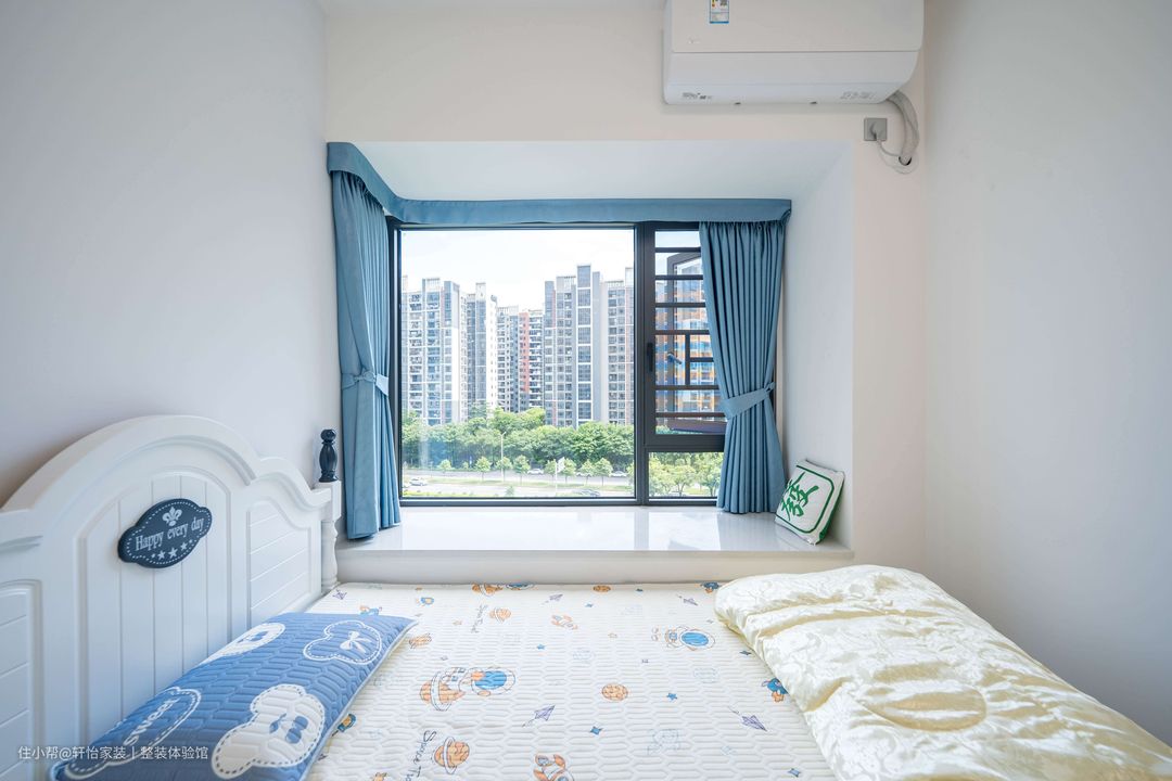 儿童房选择蓝色床,为孩子创造一个欢乐、温馨的空间。蓝色代表着自然和活力,能够给孩子带来愉悦和平静的感觉。蓝色床的选择可以是明亮而柔和的蓝色,搭配舒适的床垫和可爱的床品,为孩子提供一个舒适的睡眠环境。 飘窗的设计增加了孩子娱乐的空间,可以看到外面的景色。窗帘也用蓝色的与空间的主题相呼应。 玩具被组织得井然有序,可能通过柜子、架子或储物盒进行分类和摆放。儿童房的设计注重安全性和易于清理,以便孩子们自由地玩耍和探索,同时也能让家长们保持整洁有序的环境。