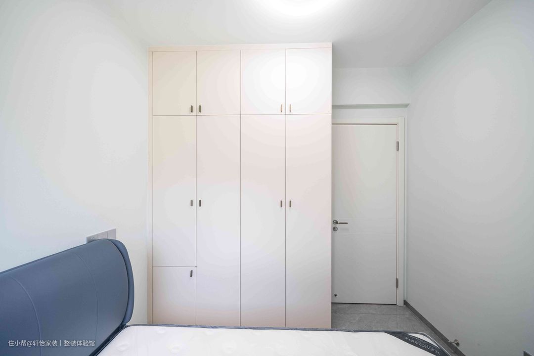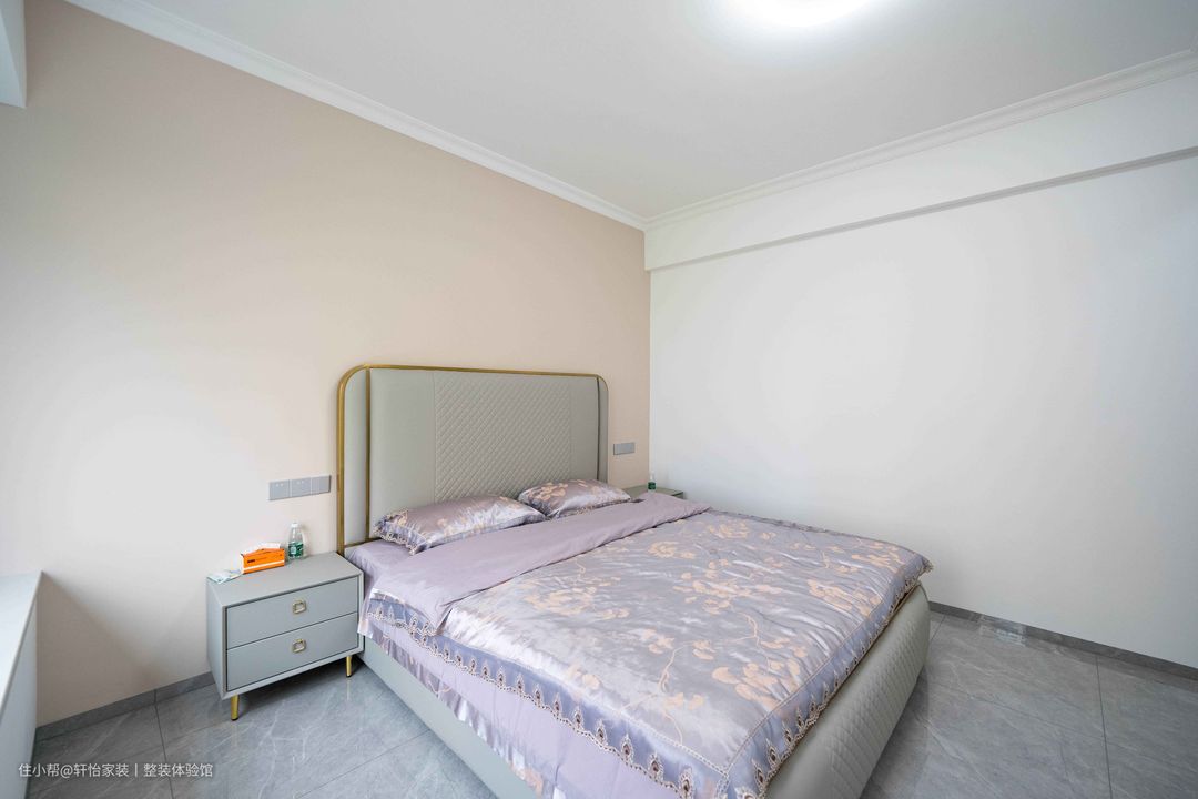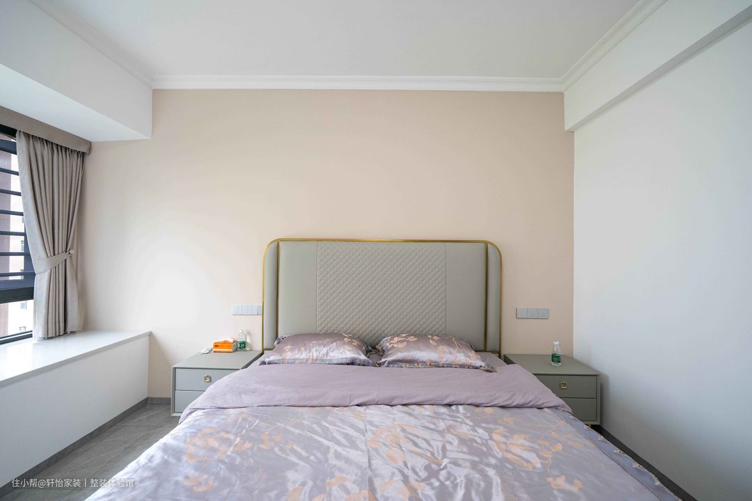 卧室入门有一条狭长的走廊。在走廊的墙壁上巧妙嵌入到顶衣柜,形成一个简洁精致的一字型衣帽间。衣帽间将被柔和的筒灯照亮,为房间带来明亮的照明。 主卧背景板则采用了咖色壁纸,明亮的灯光与之相得益彰。粉紫色床品的搭配蕾丝花边的点缀,床是真皮质的,有着金边嵌入,高级大气,增加视觉层次感。床侧的斗柜恰到好处地增加了储物空间。飘窗铺设了软垫,打造出一个温馨的小憩角落。 床侧的斗柜恰到好处地增加了储物空间。飘窗铺的设计,打造出一个温馨的小憩角落。