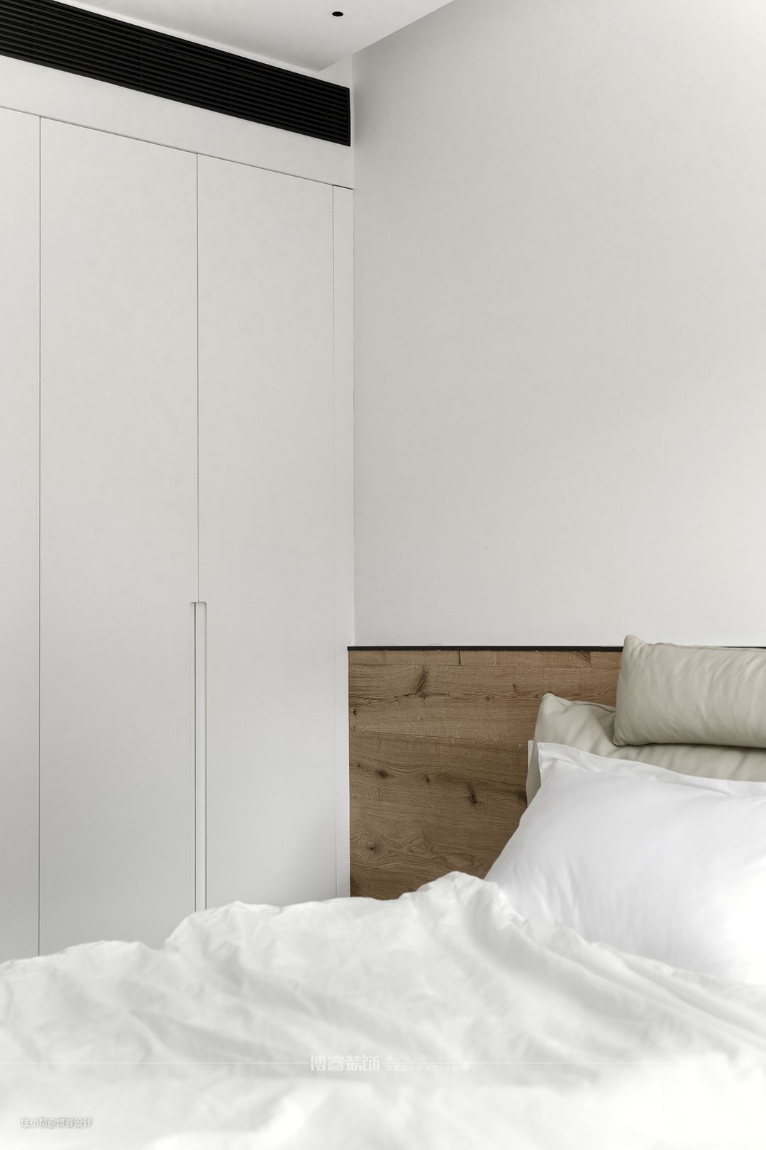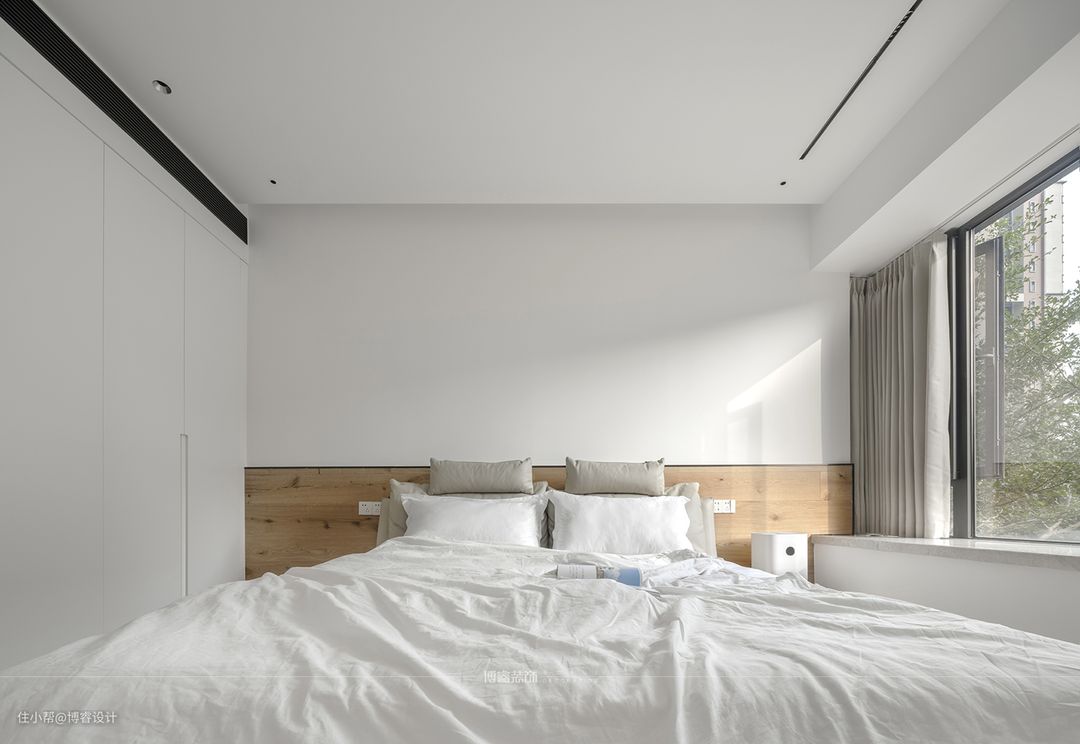 床头背景是将地面木地板延伸上来铺贴成半高的形式,整体设计简约大方。阳光正好时,洒落在柔软舒适的床品上,与自然接轨,从心灵上给予居住者一个舒适温馨的睡眠环境。