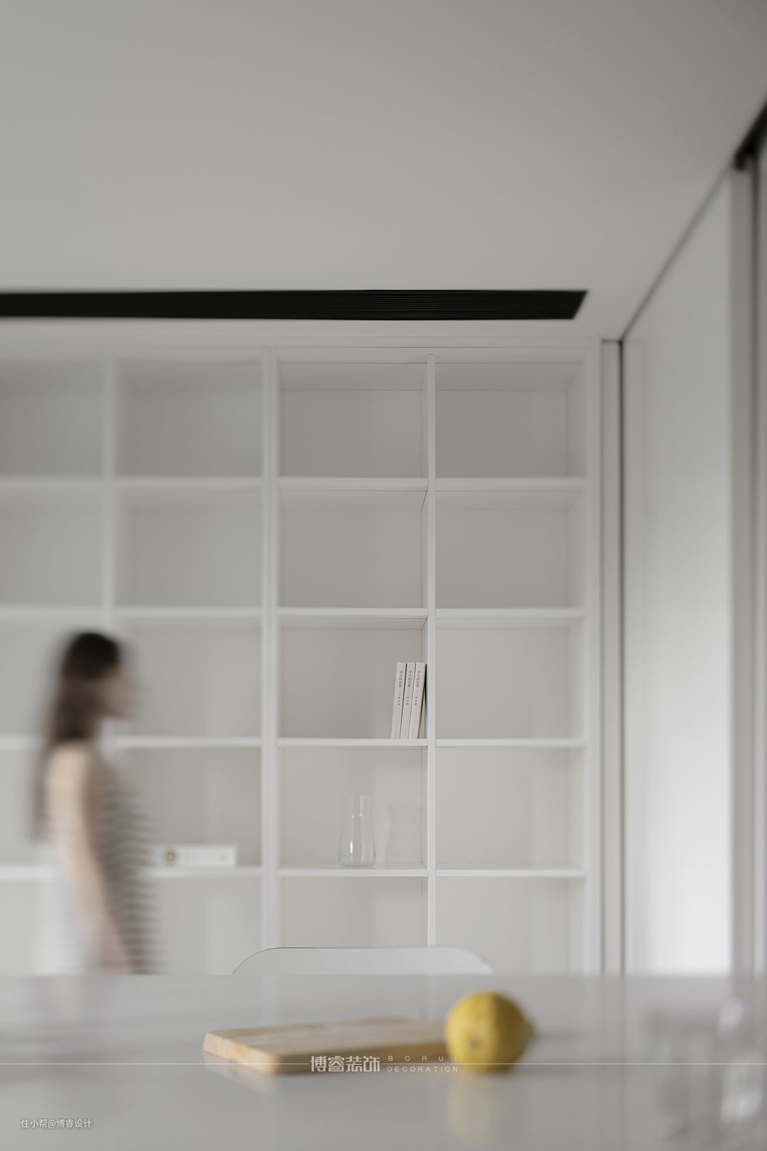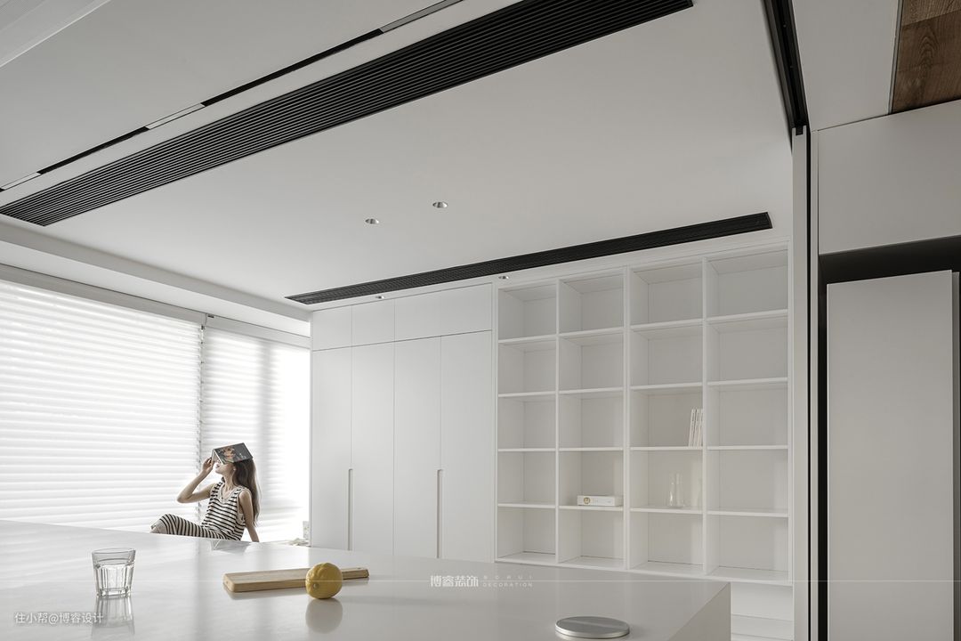 1. 将原有中厨和次卧室打通,改成了一个开放式厨房,扩大了整个厨房及餐厅的空间,同时增设了岛台功能,视野更开阔,光线更充足,南北形成对流。 2. 岛台后面自然形成了一个多功能区(小孩休闲、看书、临时客房、小影音室)书墙旁做了三趟隐藏式推拉门,平时可打开解放整个空间,需要成临时卧室时可拉上推拉门及岛台上的幕布作为一个临时独立的空间。 3. 餐厅旁增设了西厨柜,功能储物及美观同时兼备。这样一来,可以将中厨和西厨分开布局,更适合多种饮食习惯的家庭,充足的储物空间可以让厨房归纳有序,不仅拿取方便也让整体更加简洁。