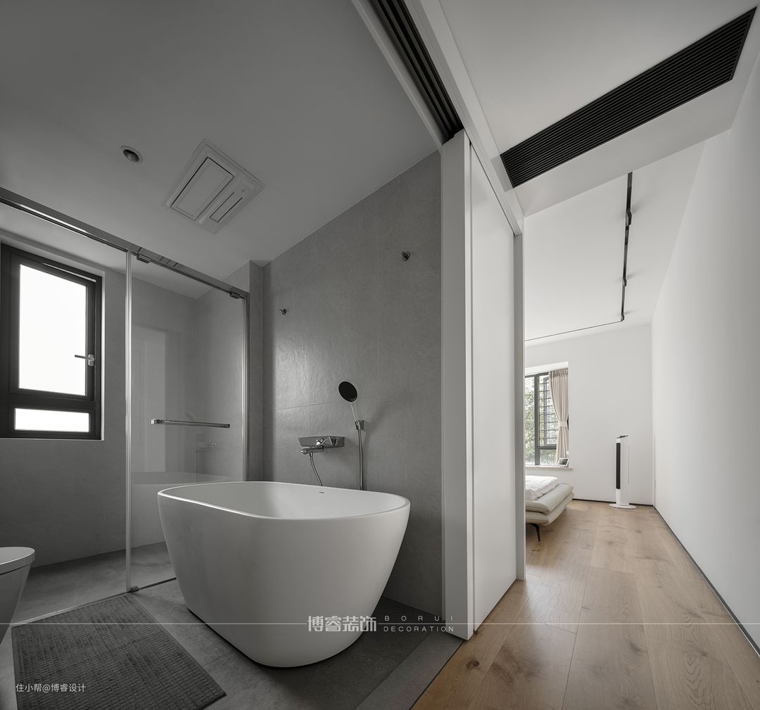 将洗手间的门做成了推拉形式,打开时存放于衣柜侧面,不用占用洗手间内空间。洗手间采用干湿分离,让内部空间更加宽敞明亮,提升整体的使用率。