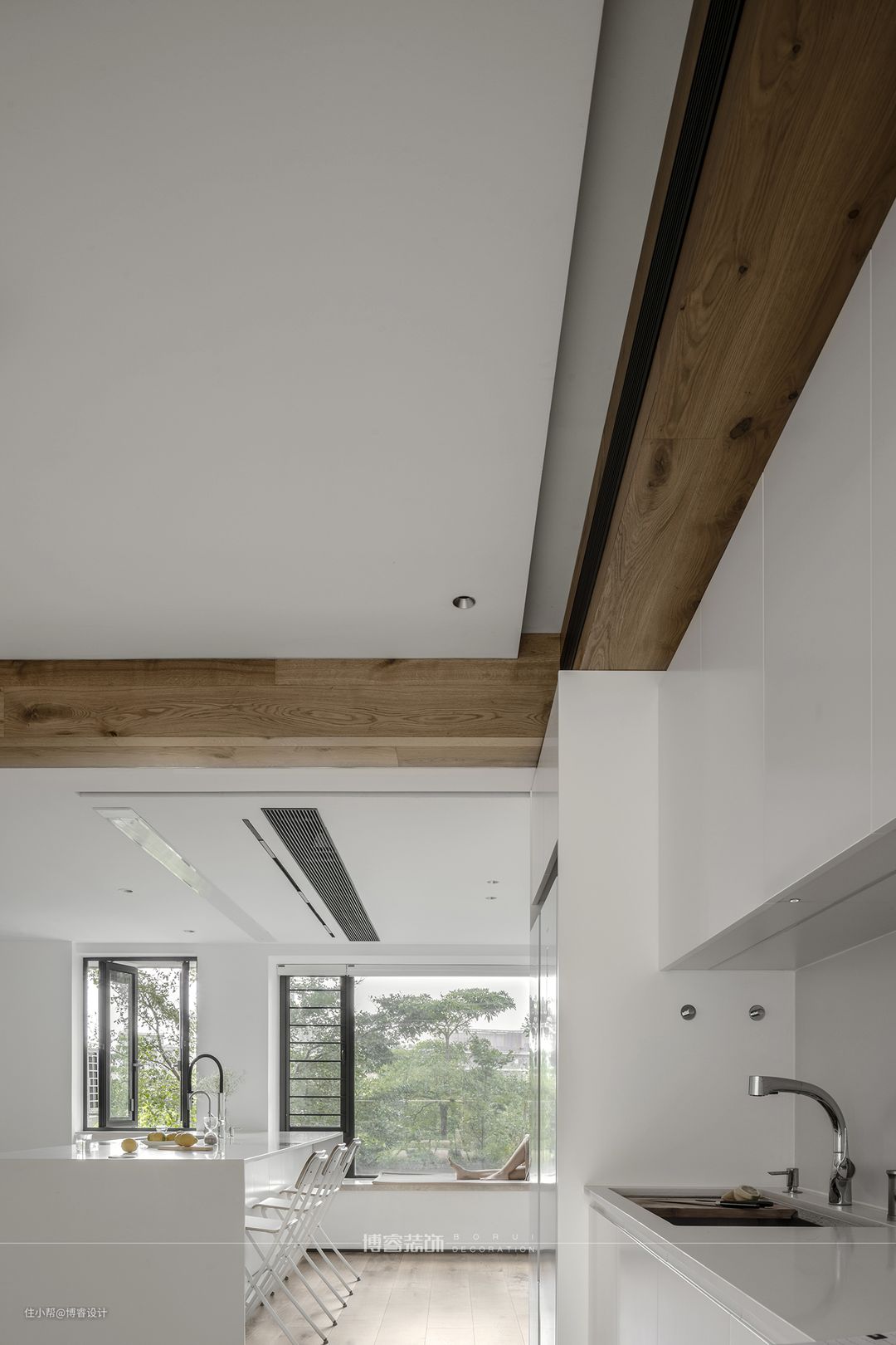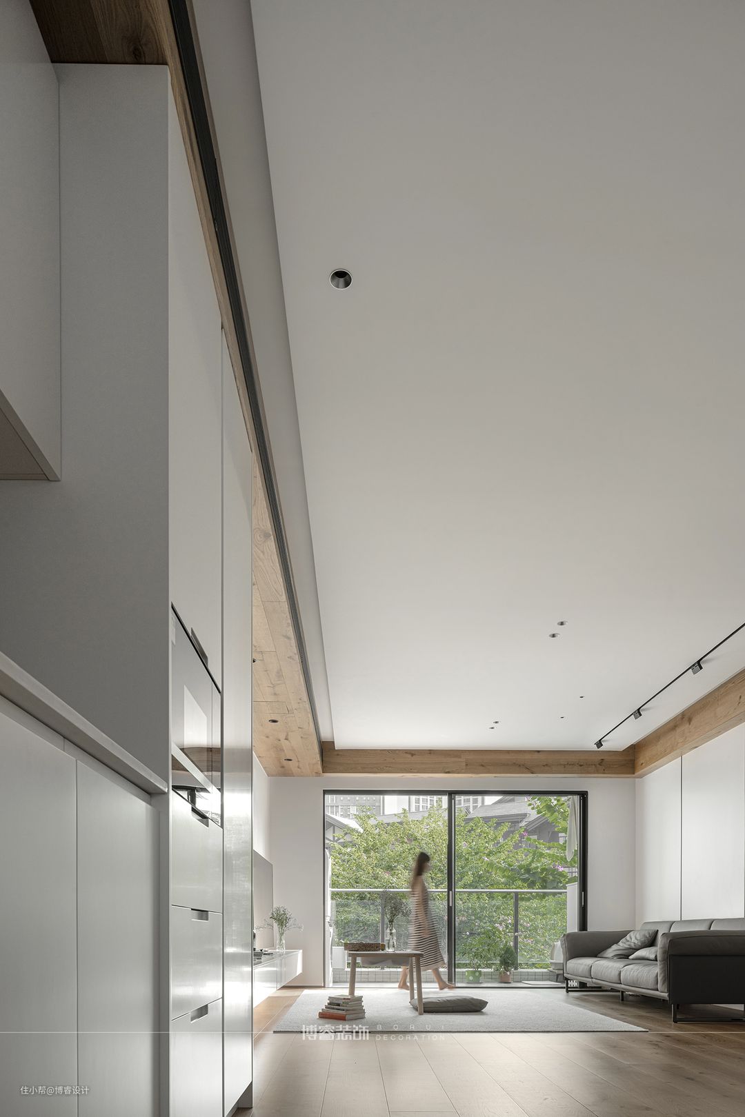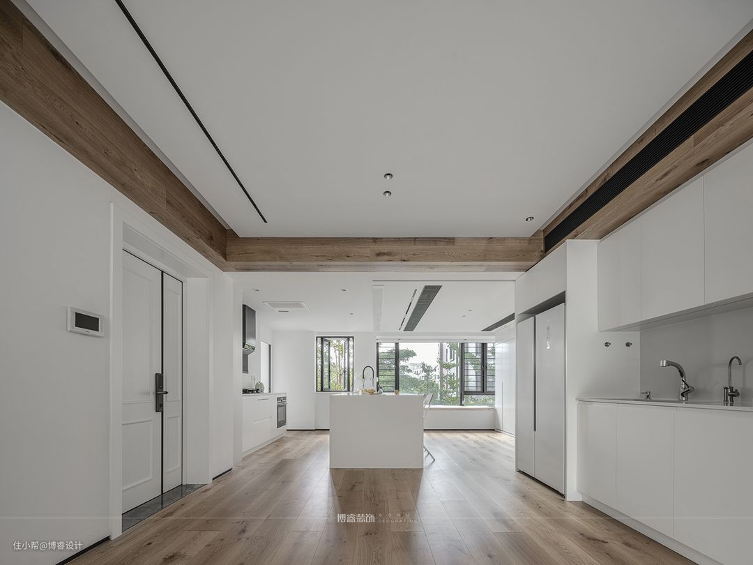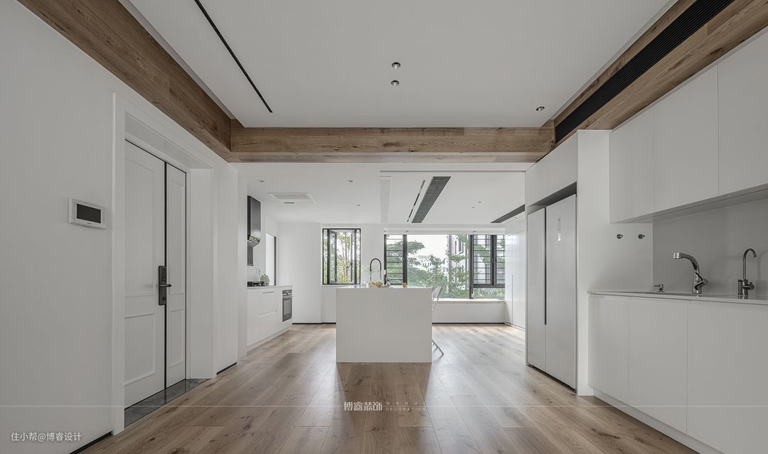 考虑到小孩还小,目前几年都不放置传统餐桌,平时可在岛台上用餐,客厅区也不放置茶几边几等家具,将更多空间留给小朋友活动。整个厅打开后长度接近14米,通铺了大尺寸的木地板使空间更温润柔和,脚感舒适。