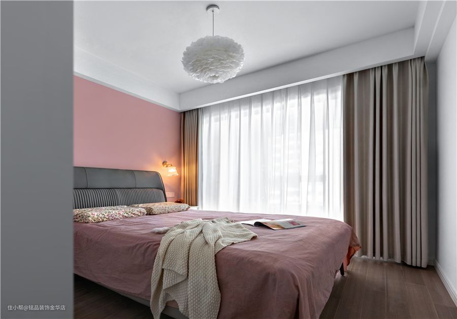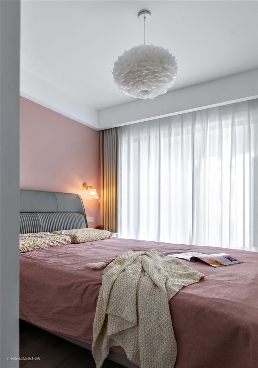 儿童房是小公主的居室,用粉色和灰色完美结合,甜美中又多了几分大气感。羽毛吊灯为空间增添了几分可爱和童趣感。深灰色的皮质床,带来沉稳的气质,适合很多风格,底部有褶皱线条的设计,层次感十足。