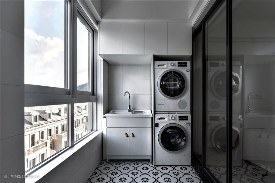 阳台做了封窗,将其设计为生活阳台。靠墙定制一组台盆柜,将洗衣机烘干机上下摆放,地面铺贴小花砖,增加趣味性。