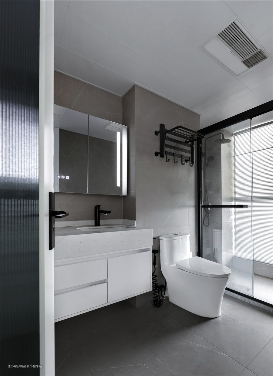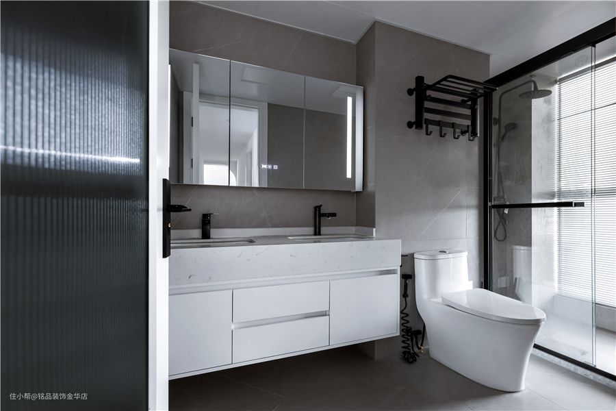 卫生间地面墙面统一用灰色瓷砖,台盆柜和马桶为白色,整个空间色系充满干净利落感。双台盆设计可以提高生活效率,而且两个人一起洗漱的画面也很温馨。台盆区周围的日用品,可以按照合理的顺序收纳于镜柜内,避免因杂物过多而带来的凌乱感。