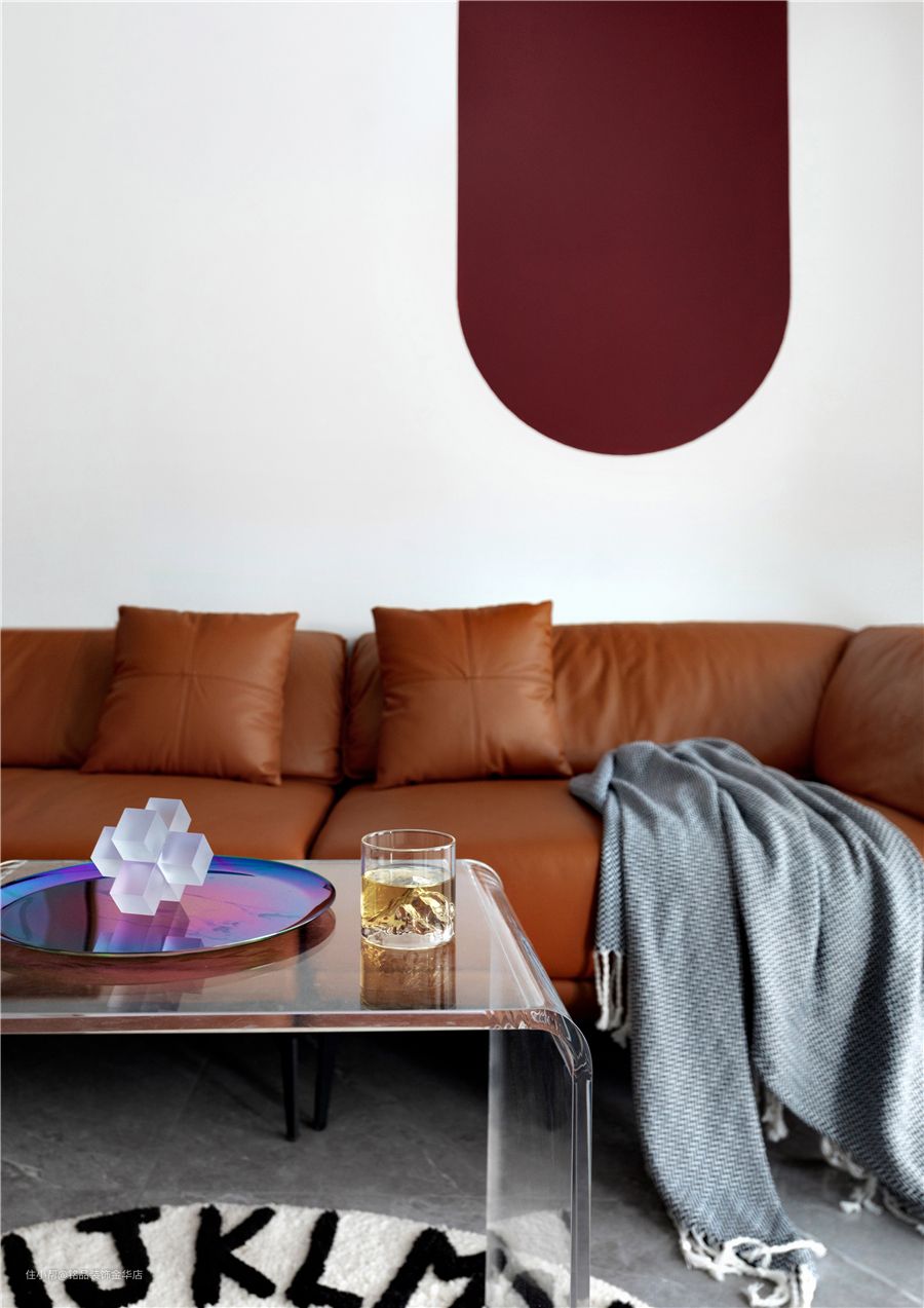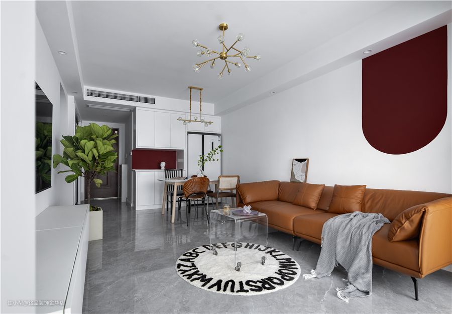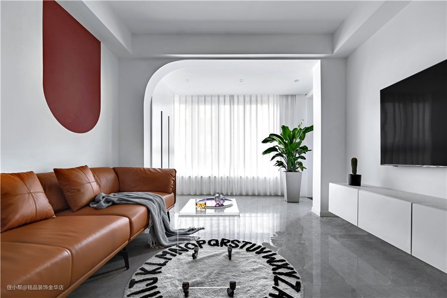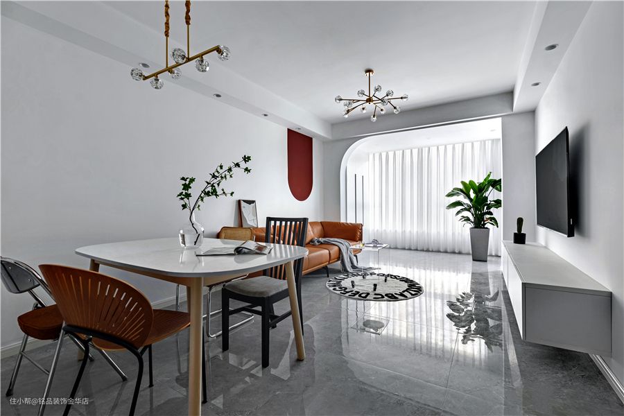 走进客厅,第一眼是被客厅与阳台间的拱形墙所吸引,绿植的加持,将景引入室,特别富有诗意。客厅的弧形分色墙与之呼应,更显灵动,给空间增添了些许柔和的气息。整个空间的地板选用灰色大理石瓷砖,有延伸空间的效果。客餐厅背景墙统一使用白色,整体效果更好。家具配饰的选择上,以饱和度较高的色系为主,中和空间的单调感。沙发是焦糖色皮质沙发,温柔中带有硬朗的气质,是提升空间华丽质感的主要元素。