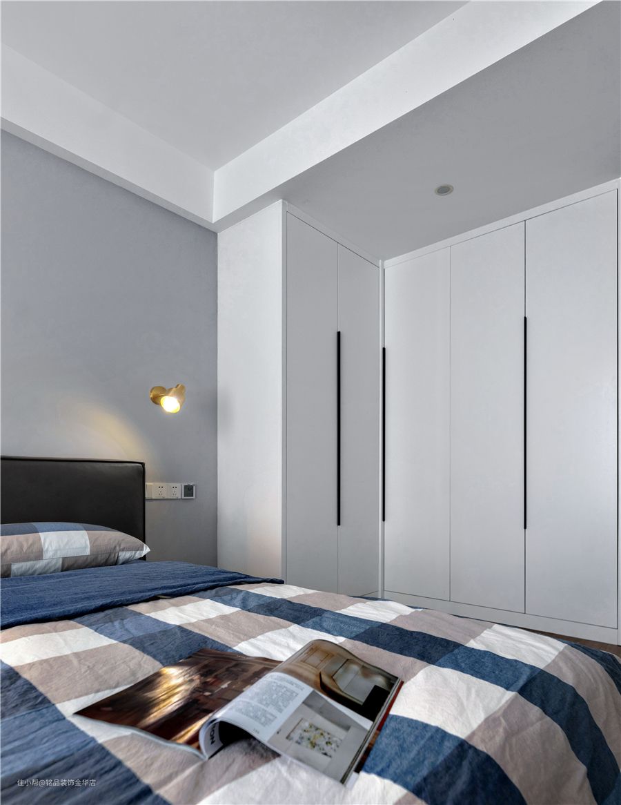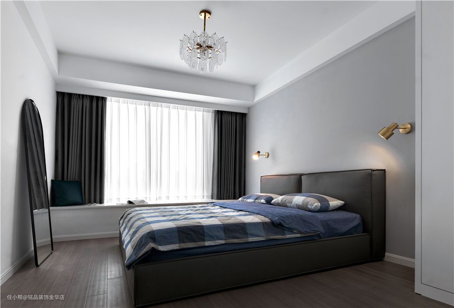 主卧地面使用胡桃木地板,背景墙是简单的灰色壁纸,搭配深色系的软装配饰,整体是高级的中性色调之家。靠近墙体做了“L型”的衣柜,柜门和拉手与门同步,使用白+黑色,整体简洁又不失层次感。灰色落地皮质床,给人一种高级神秘感,在无声中把落落大方的品味铺开,带来更高层次的享受。窗帘也延用灰色系,深深浅浅,互相交错。