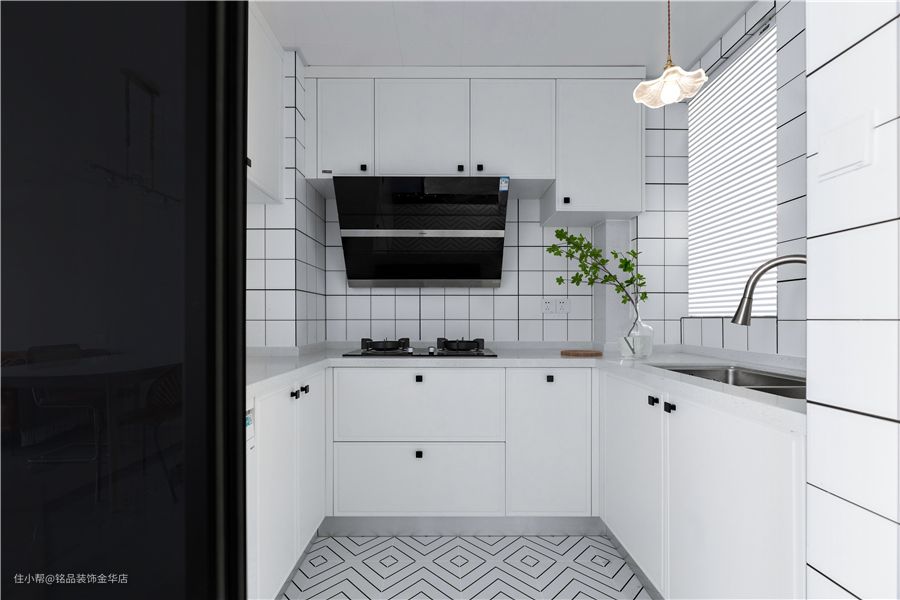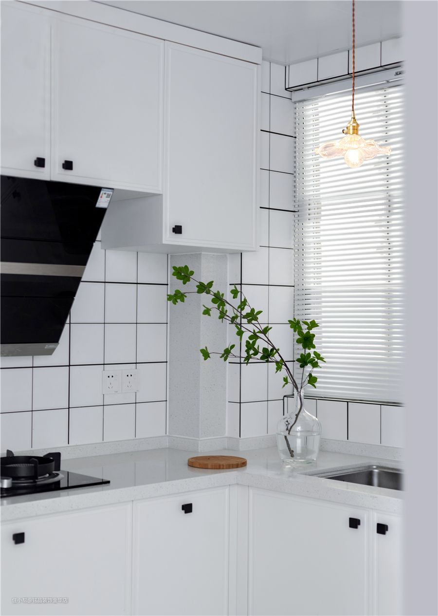 厨房空间较小,以白色为主,黑色为辅。白色橱柜,小方砖背景墙,白色百叶窗,黑白图形地砖,各元素糅合在一起,简洁大方又不失质感。台上的绿植带来清新自然的气息,搭配黄铜玻璃质感的荷叶吊灯,这一角,充满梦幻感。