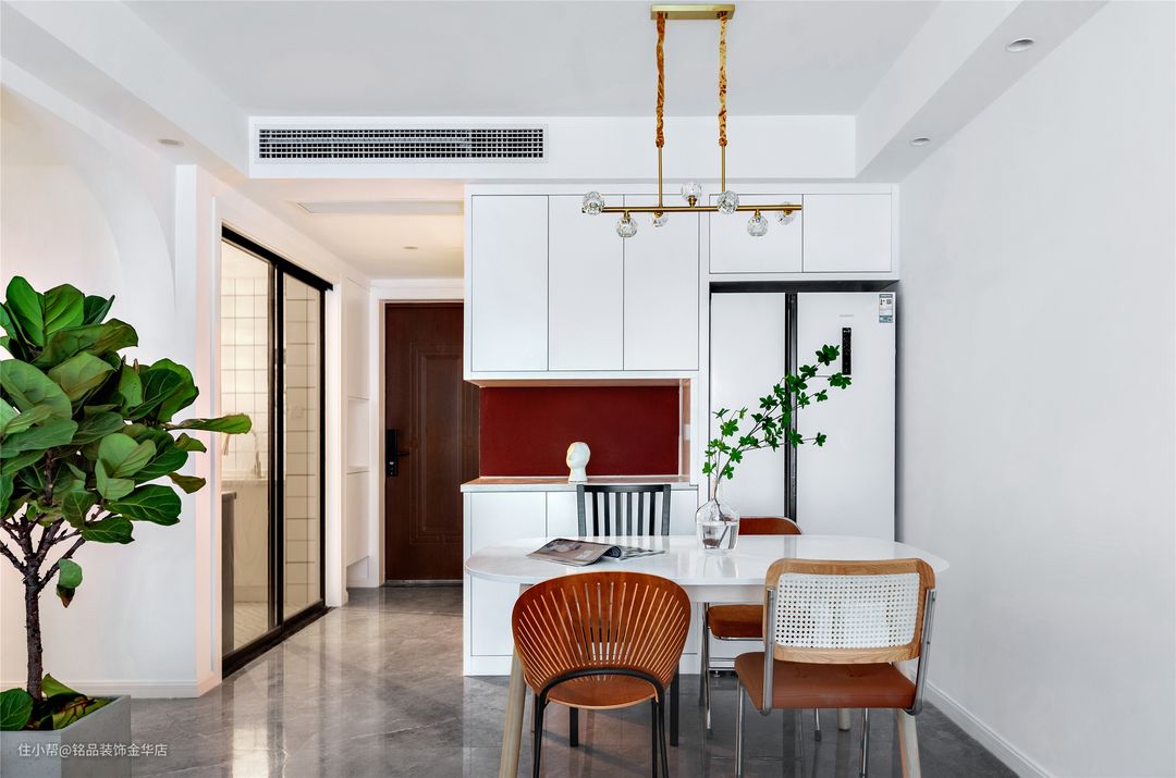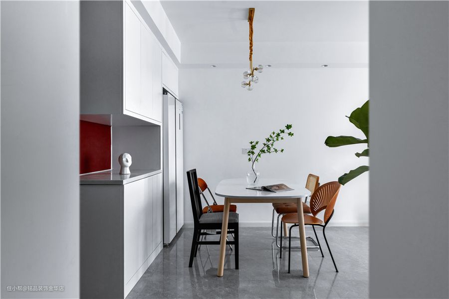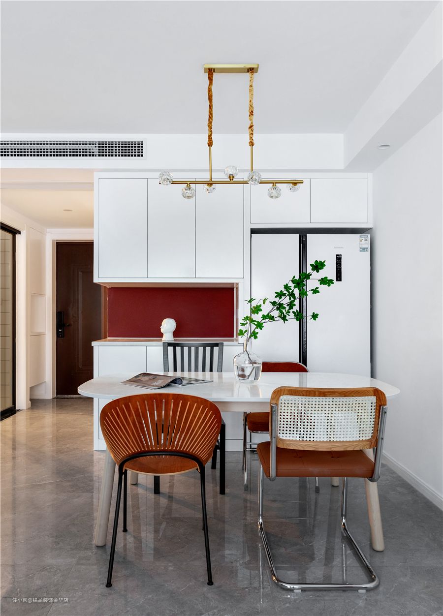 客餐厅是开放式的布局,这样的设计在小户型家庭中特别常见。两个功能区域没有明显的隔断,而是以不同的吊灯在视觉上划分空间。餐桌是简约的白色桌面搭配木色几脚,在边角处做了弧形处理。餐椅选择了四款不同样式的组合在一起,有贝壳椅、藤编椅、实木椅和布艺椅,营造出雅致的用餐空间。靠墙做一组餐边柜,留出空间,将冰箱嵌入其中。另一侧中部留空,放一些物品或摆件进行装饰,露出的台面涂刷成红色,与客厅分色墙互相呼应。