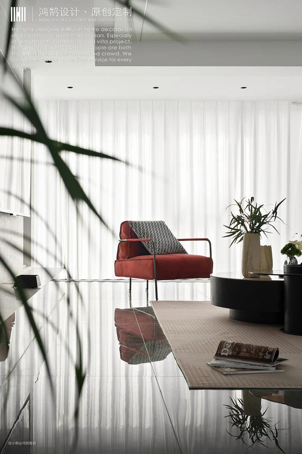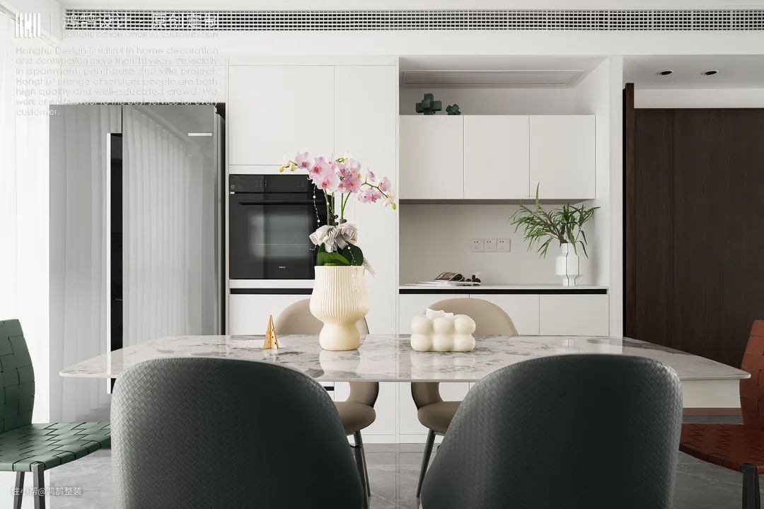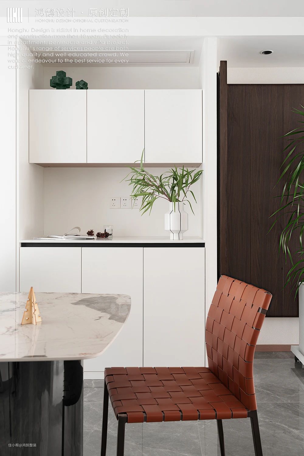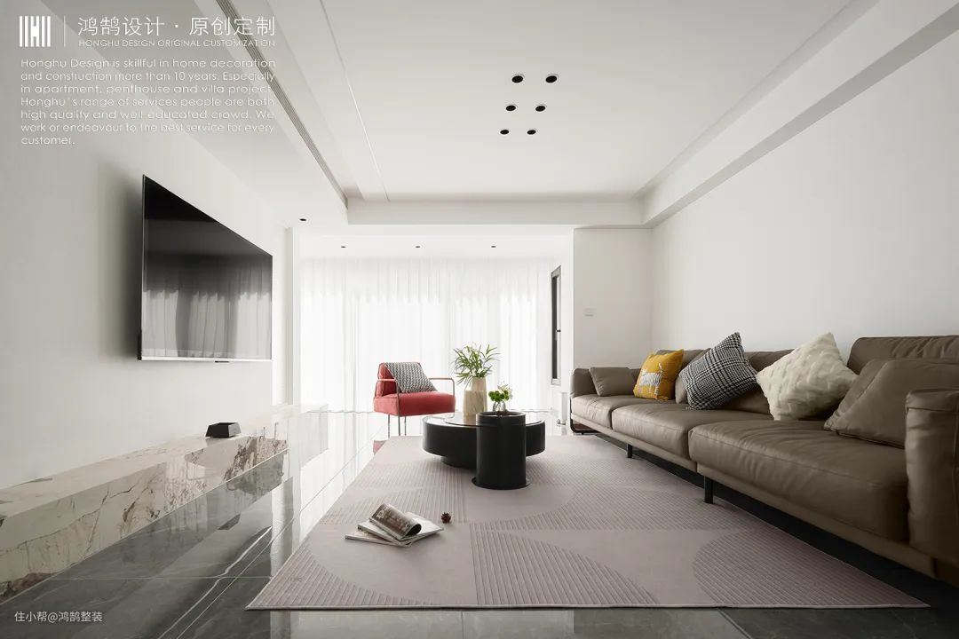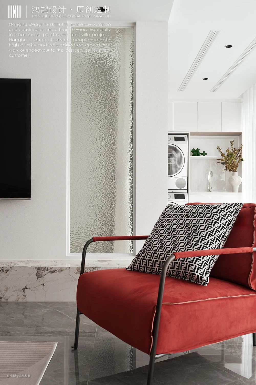 墙面摒弃了大面木饰面或者岩板平铺而选用纯白色海基布,保留了原有户型结构的美感立;软装上面利用一些亮色,来增加空间的层次;