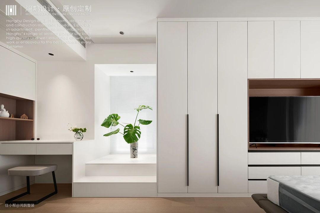 主卧没有选择单独隔出一个衣帽间,而是选择了沿墙面做了收纳和休闲区,这样空间的格局变大,同时也让整个空间的采光变多,功能也更加齐全。