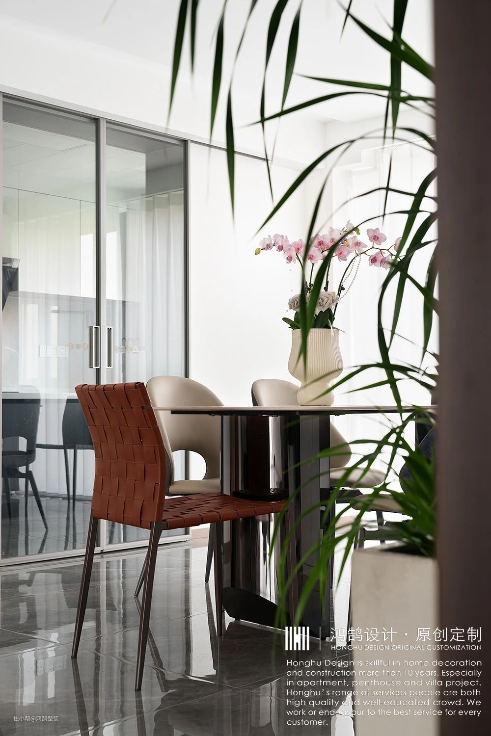 圆桌的餐桌选择,更适合这个空间的动线,剔透的圆柱餐桌脚,以及调色的餐椅,让整个空间有了灵动感。
