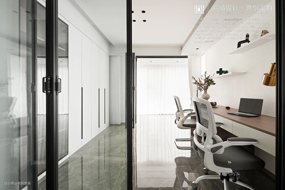 半敞开式的书房,一方面采光有增加,另一方面能与客餐厅阳台有更多的互动;采用联动的玻璃隔断移门,更适合这个书房的空间。