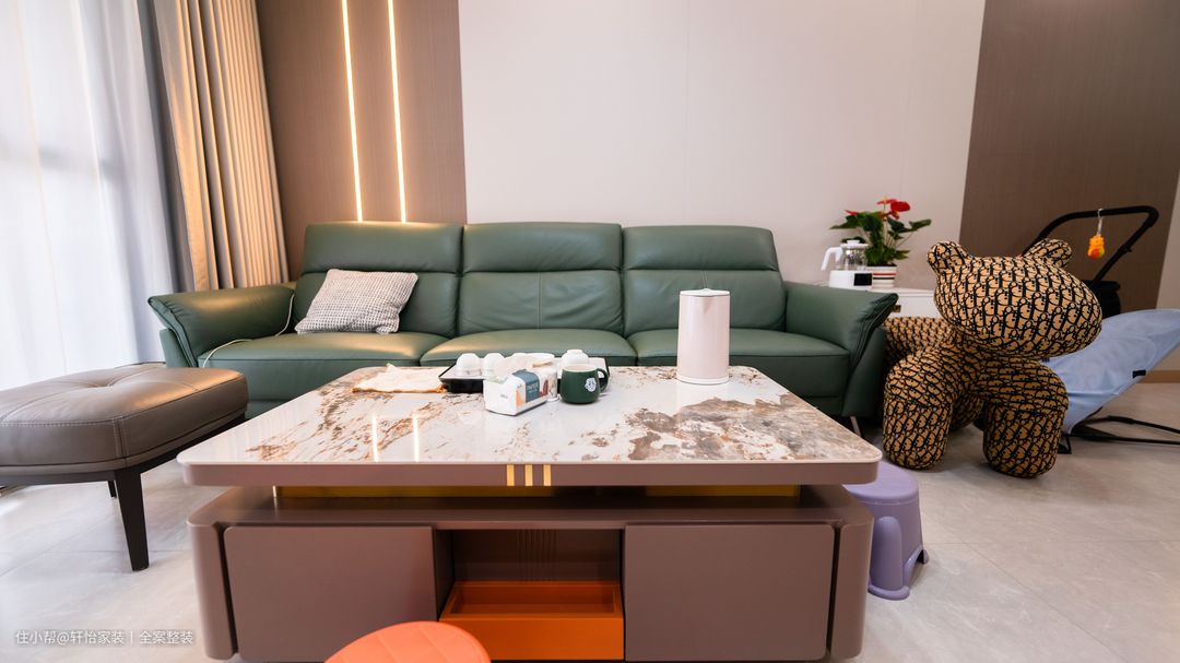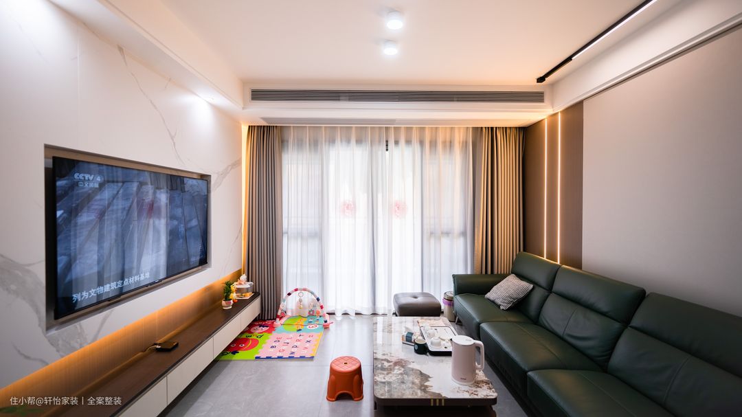客厅的设计以白墙和白色电视柜为基调,搭配大理石花纹墙面和一张长沙发,营造出现代、高雅的氛围。阳台采光非常好,让您可以享受到充足的自然光线。大理石灰色地板的质感,让空间感觉更加通透和自然。 墨绿色的长沙发作为客厅的主要家具,不仅提供了舒适的休憩空间,还展示了现代时尚的设计。沙发的皮材质和颜色,为客厅带来一种自然和亲切,大雅的氛围,同时也增加了整个客厅的流畅感。一个艺术性的櫈椅增加空间的艺术性。 一字型电视柜简单雅致,十分整洁美观,同时大理石背景墙周围嵌入灯带,氛围感十足。