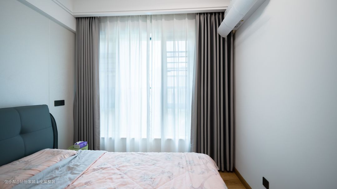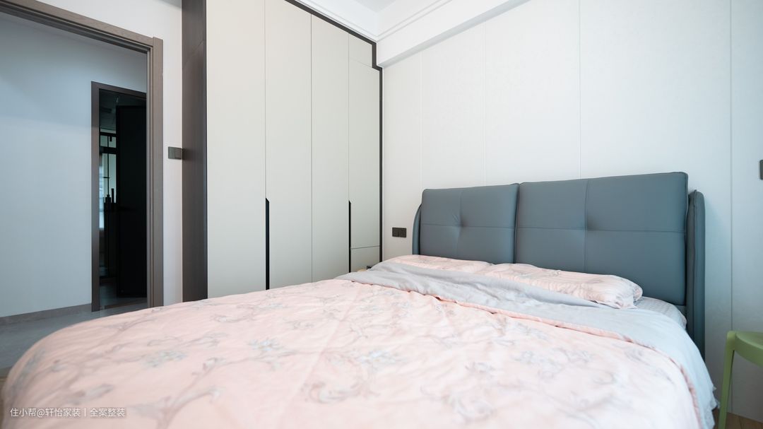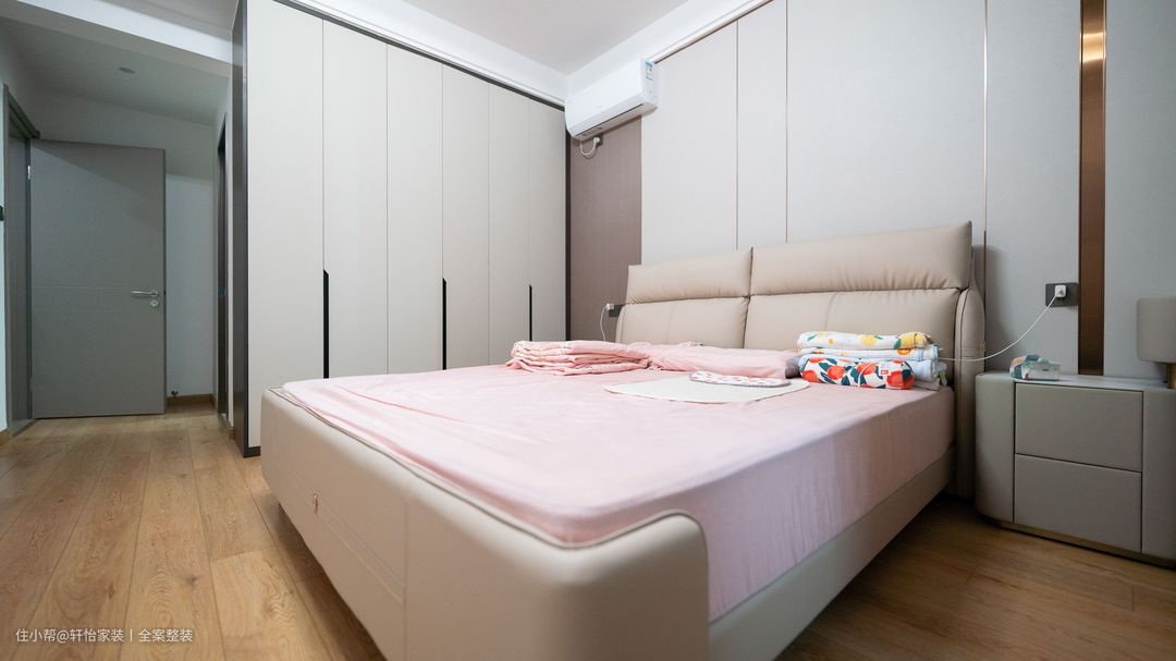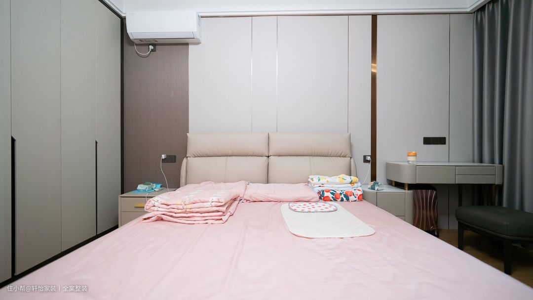 浅浅的米白色和原木色作为背景墙的颜色。搭配粉色的床品进行点缀,为了增加房间的层次感和视觉效果,使用了皮质的米白色的背饰板来连接双床头柜。这种设计不仅提供了储物空间,背饰板的选择与主色调相呼应,使房间的装饰更加协调统一。 床头处设计精巧的悬空抽屉式收纳柜,节省了房间的地面面积,采用了独特的悬空设计,台面用作了梳妆台,其台面宽敞,足以摆放各式各样的梳妆用品,主卧是长型衣柜,选择了隐形的推拉柜门,可以一目了然地看到衣物的摆放和整理。门的颜色与空间的主题呼应,衣柜内部合理地划分了不同的空间,以便更好地组织和存放衣物、鞋子和配饰等物品。柜子内部配备了可调节的衣架、抽屉和储物盒等功能,可以轻松找到所需。