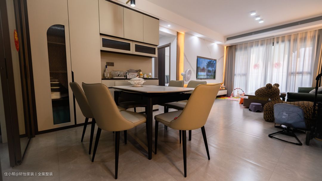 背景墙采用柜体装饰增添了空间的层次感,实木光泽餐桌脚稳定耐用,搭配米色餐椅,增加了整体的温暖感,整体氛围打造品质与舒适感。 餐边柜依靠墙面巧妙结合半封闭设计,既可隐藏杂乱,又提供展示空间,原木色点缀增添美感。满足储藏、展示需求,提供时尚实用设计。饭厅收纳柜设计实用、美观,有效提升空间利用率,满足展示与储藏双重需求,营造舒适用餐环境。