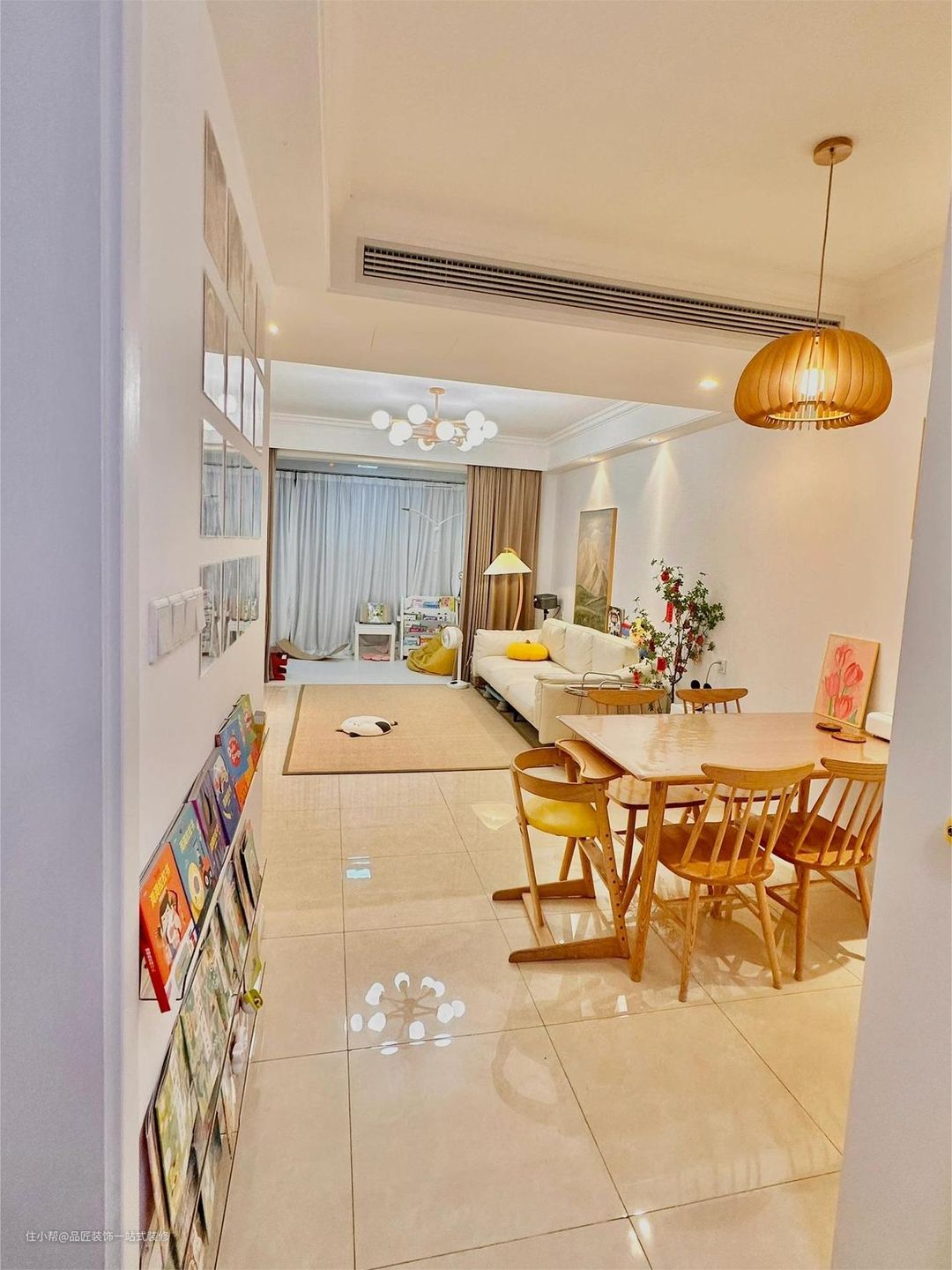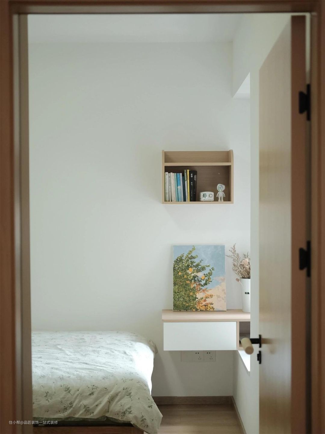 客厅客厅不做背景墙,不安装电视,投影到白墙上观影,省钱的同时也不占空间,留出更多位置给小孩玩耍。餐厅进门就是餐厅,利用一面墙做餐边柜,放置物件。走道走道一面做成定制柜,弥补小户型做全屋定制柜的遗憾。主卧床尾做整面墙衣柜,增加收纳面积,适合小户型的家。次卧床尾飘窗做成书桌,床头柜小巧实用,还能节省空间。