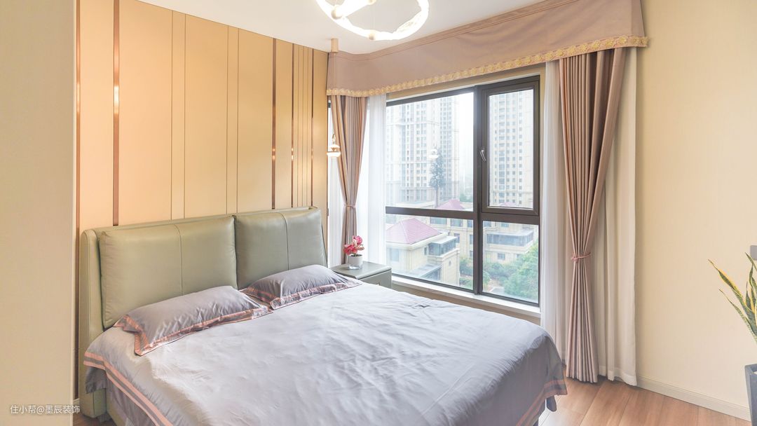 主卧室采用硬包背景墙中间穿插金属线条使得简单的卧室也变得奢华起来 薰衣草紫的部分软装也使得卧室重回温馨
