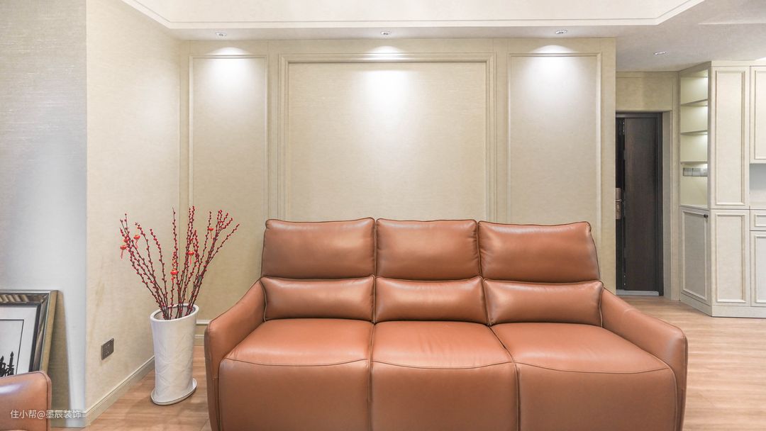 沙发背景摒弃传统欧式复杂的造型,采用更加简洁的石膏线条作为装饰,简约而大方