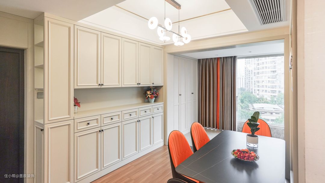 餐厅选用结实耐用的岩板餐桌,设计了一整面墙的四段式餐边柜在保证典雅效果的同时也满足了业主大量储物的需求