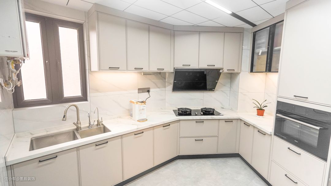 厨房巧妙地利用原始户型的结构设计出斜角橱柜同时橱柜也采用比较简约的线条搭配吊柜的玻璃门,现代与古典的碰撞