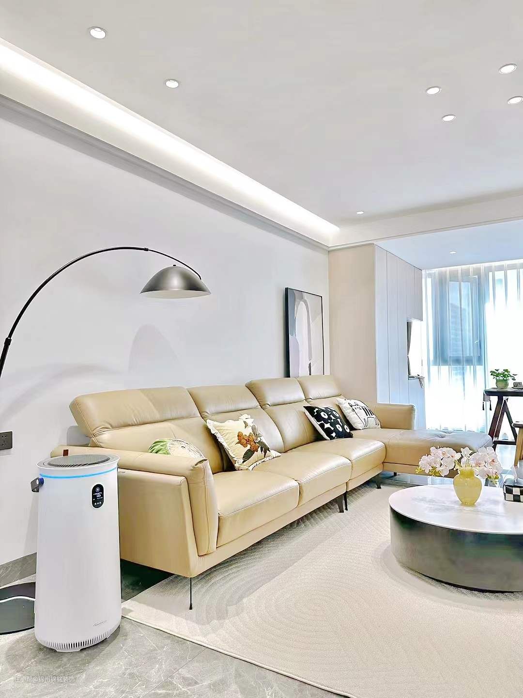 做了大平顶+边吊+灯槽设计,层高足够要尝试全屋无主灯,耐看不压抑,居中和电视背景墙都装射灯增加氛围感,干净的小山丘真的给背景墙加分。灰色柔光砖60x120通铺。