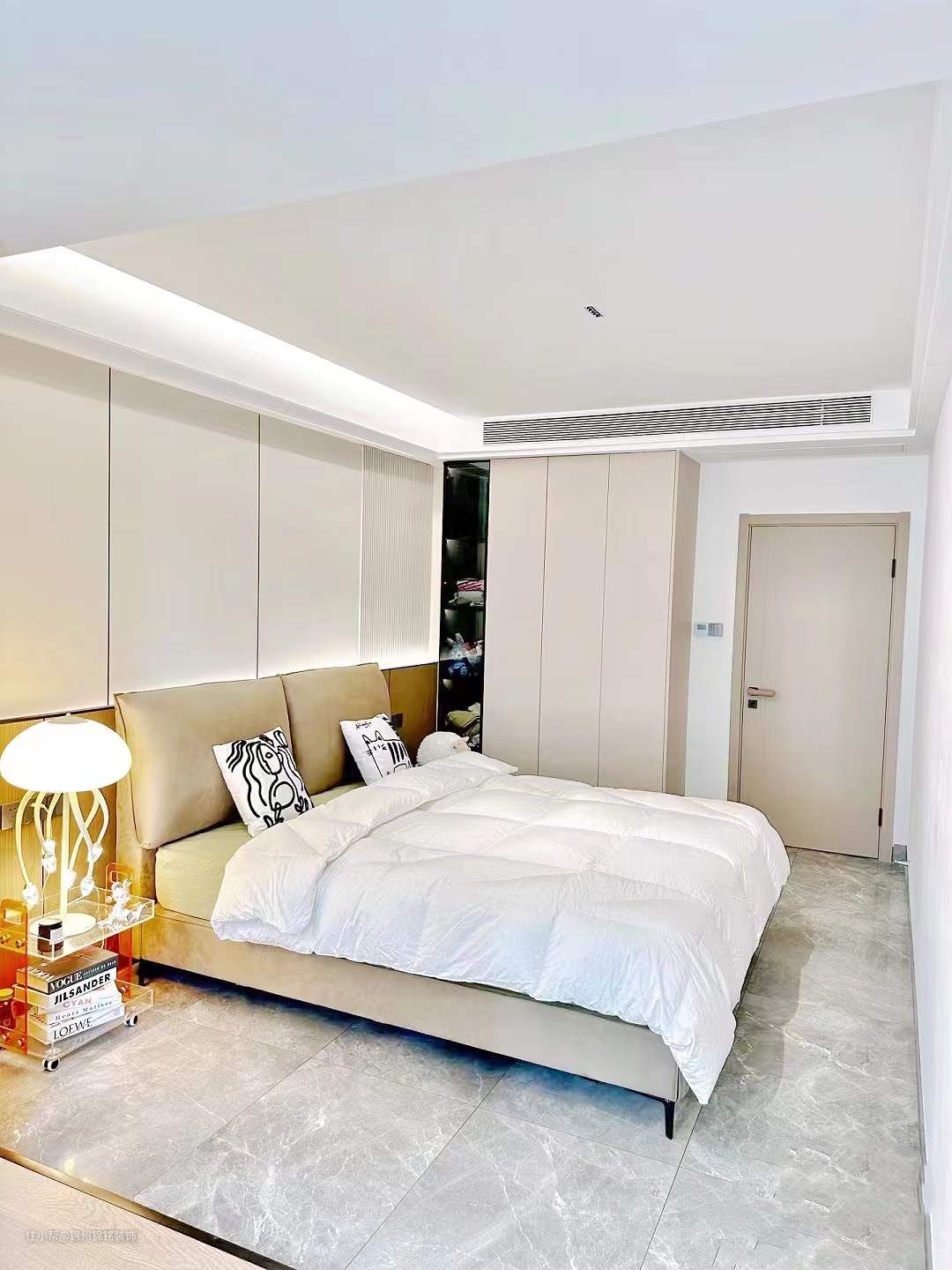 地砖是灰色瓷砖通铺,地台是木地板,可以实现光脚自由。房间是无主灯吊顶,内嵌线灯增加氛围感。
