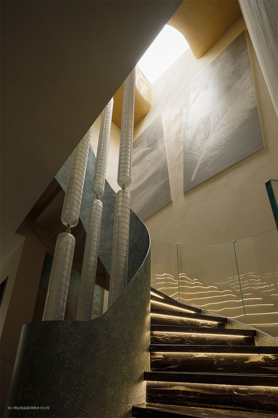 弧形的穹顶让人联想到18世纪的城堡,浓厚的艺术底蕴油然而生。空间不乏曼妙柔美的曲线,与不规则的几何造型相互交印,赋予室内蓬勃灵动的韵律。 登天揽月不足夸,撞破星河已天涯。穹顶高处设计日、月、星轮为主题的空镜,在瞳孔中洒下无数道隽永的光线。无法被忽视的旋转楼梯,青石色的扶手,云纹波层次渐染,踏步时,堂皇大道印于足下,美不胜收。