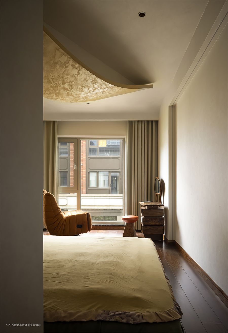 次卧选了米色系的床,在床尾放了米黄色沙发,和吊顶色系做了呼应,整个卧室吊顶和背景墙的设计是亮点,不规则的墙顶,让空间更显律动。