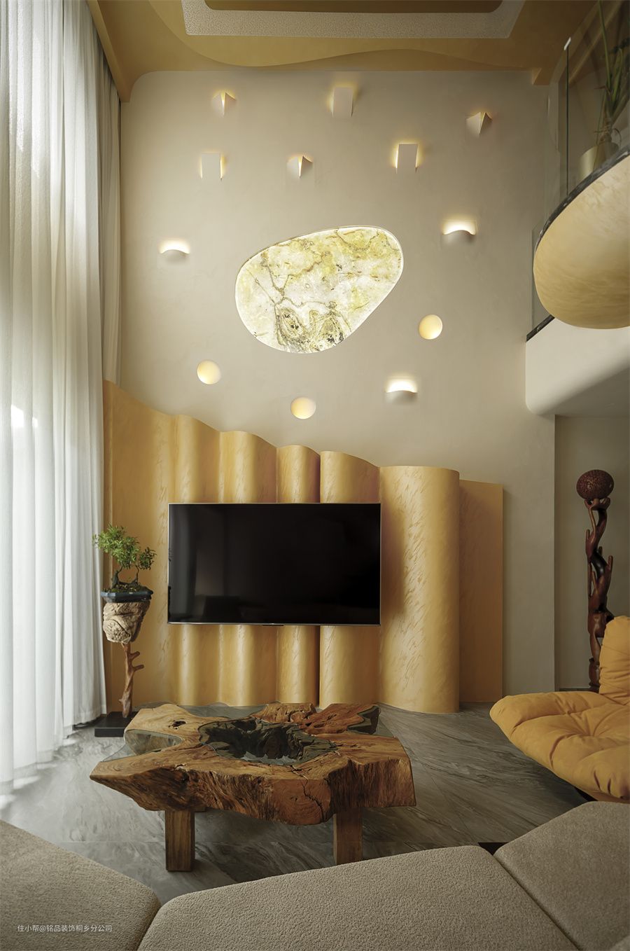 原木、天然石等不同材质和肌理的元素相互碰撞,让层次丰腴有度,挑高的顶面,分布着疏密不一的星河。借此,人与自然,艺术与生活,融为一体。 每一件家具都是精心雕琢的艺术品,独特造型和精湛工艺,增添住宅个性与品味。墙上的艺术石材造型作为引导性的过渡,将居者的审美融入空间之魂,为整个别墅注入了深度。 智能灯光则如一位魔幻的调度者,在空间中编织着绚烂的韵律。墙上内嵌的发光石膏灯与智能灯光系统相结合,创造出无尽的光影变化,为居住者带来戏剧性与神秘感。