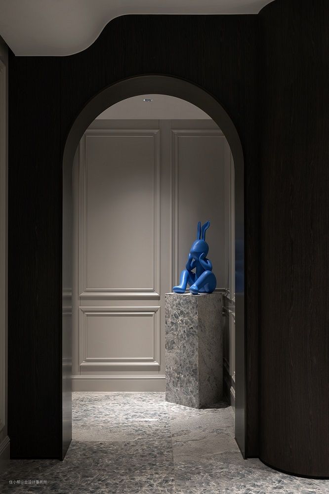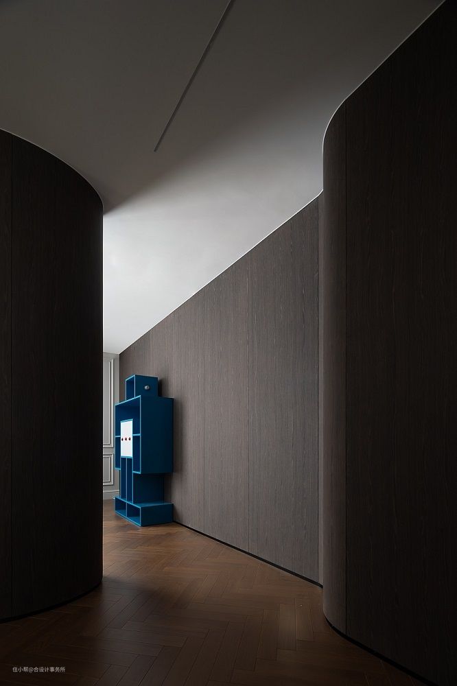 墙面使用金色壁灯和石膏线作为装饰,却不显得繁琐,增加空间的精致感。 另一个区域的走廊采用黑桃木板面全部上墙,复古元素和细腻纹理恰到好处,通过简洁的笔触,传给空间结构本身的魅力。角落摆放克莱因蓝摆件,为沉稳的走廊带来一份活力。 #走廊 #设计