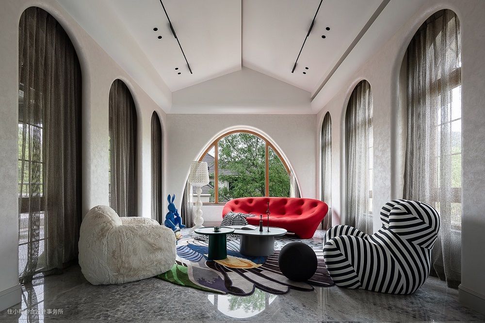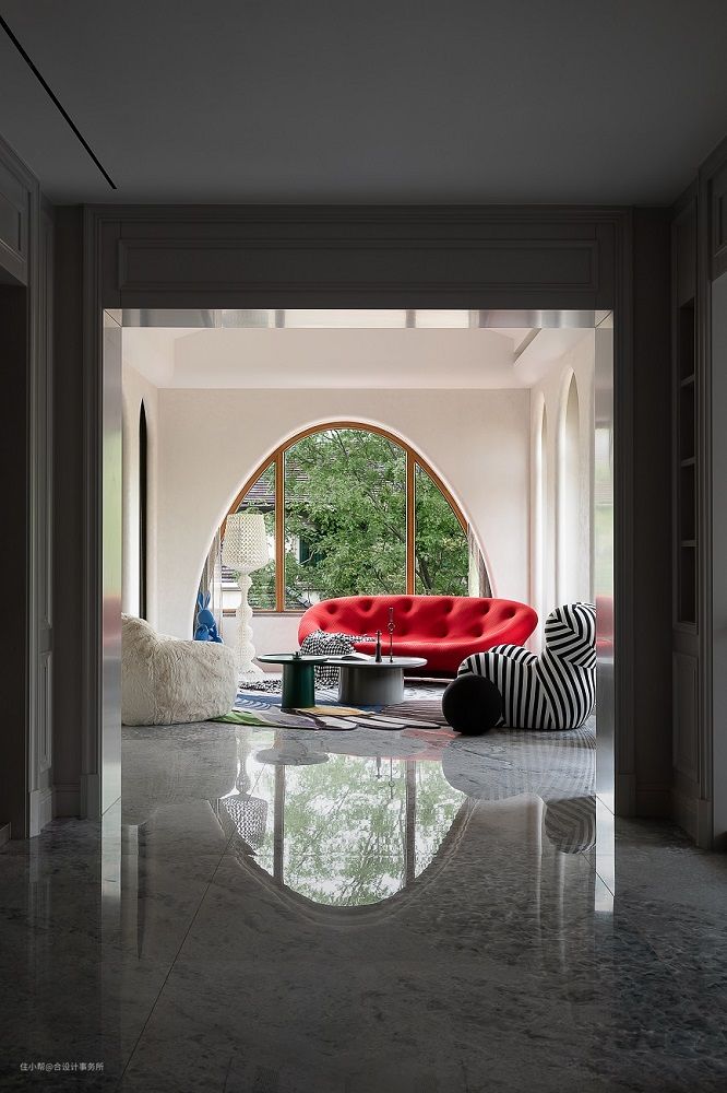 斑马条纹沙发与整个空间融合,充满了艺术氛围,造型独特的红色绒面沙发为空间注入鲜活与魅惑,作为活动区中央耀眼夺目的点缀色,浓烈色彩中和墙壁的素色,使得空间层次感更加丰富,焕醒生活激情,为活动区带来时尚复古的情调。 #活动区 #设计